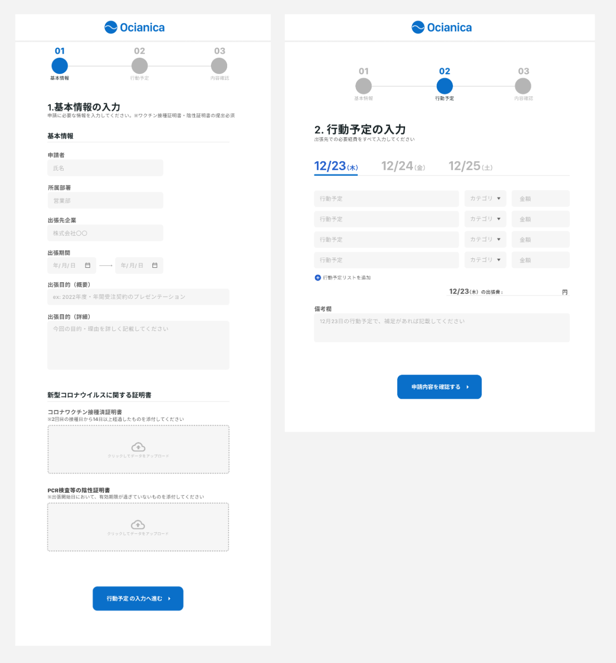 - 従来の3ステップ(基本情報→行動予定→確認画面)ではなく、単一画面で一気にユーザーに記載させる仕様にすることで、「面倒くさい」を心理障壁を軽減する試みをしている点
