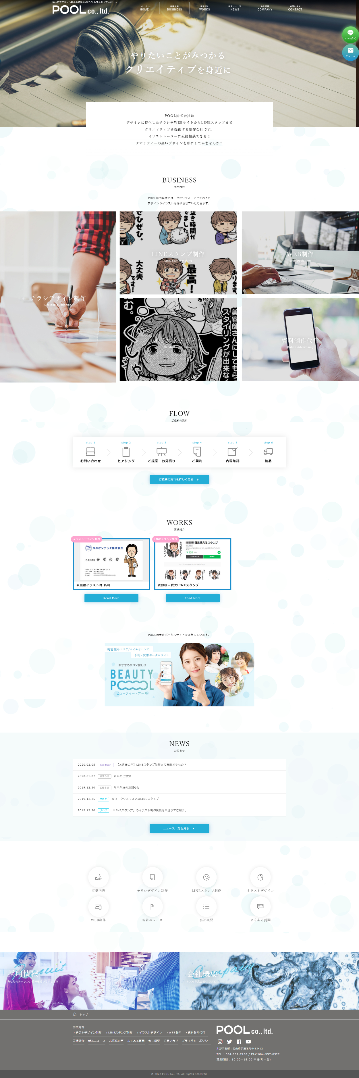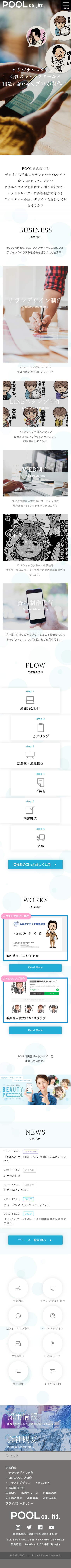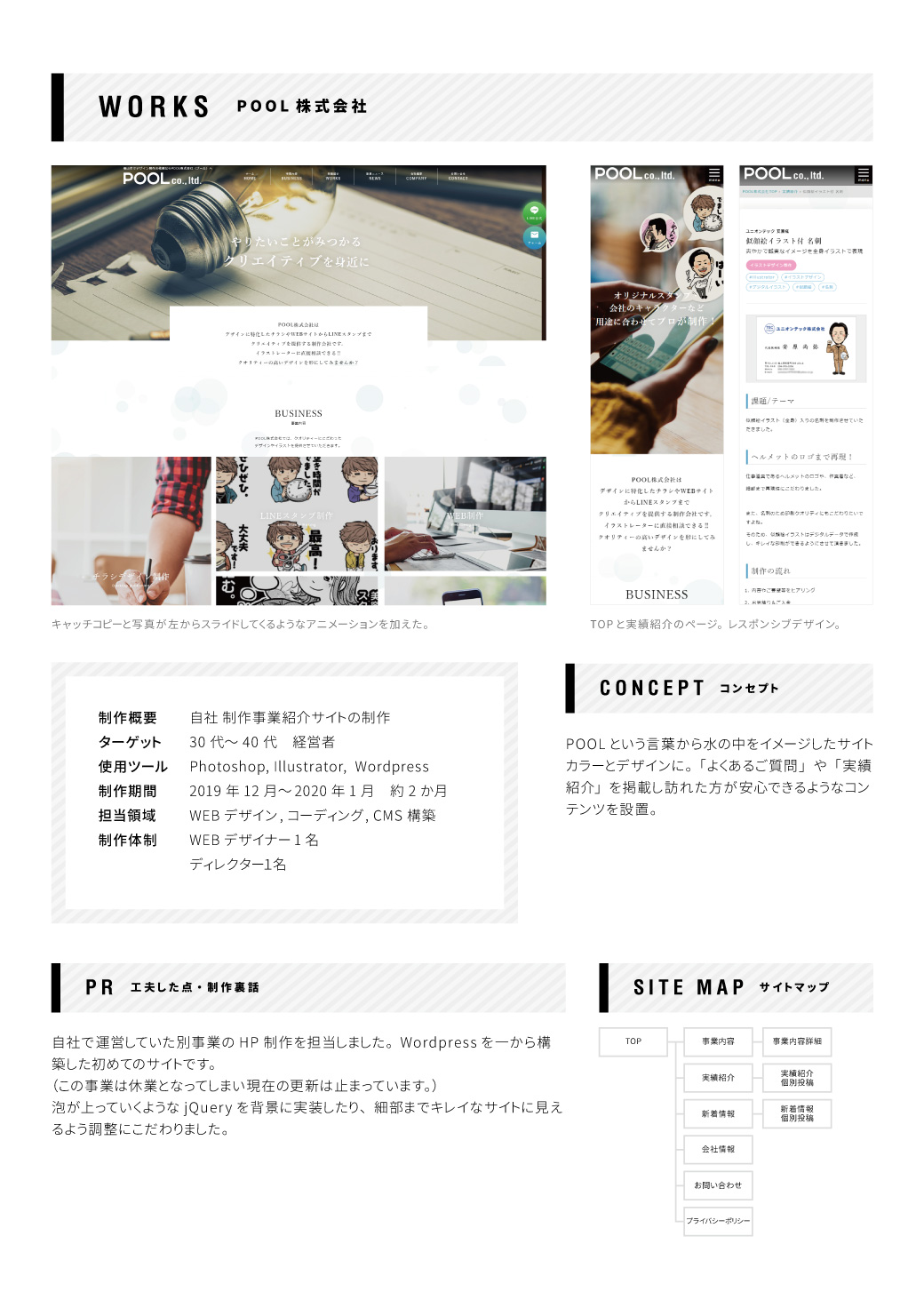 POOLという会社名から、泡を想像させるアニメーションを背景に配置。シンプルにわかりやすいサイトを目指しました。制作実績を掲載するため、カスタム投稿を設置しています。