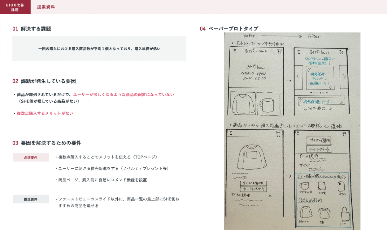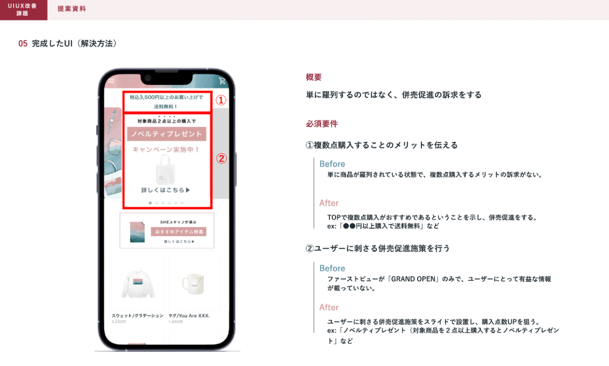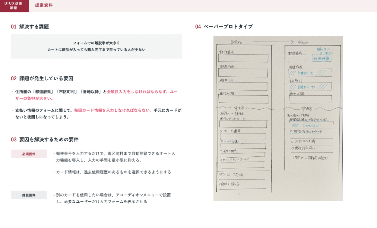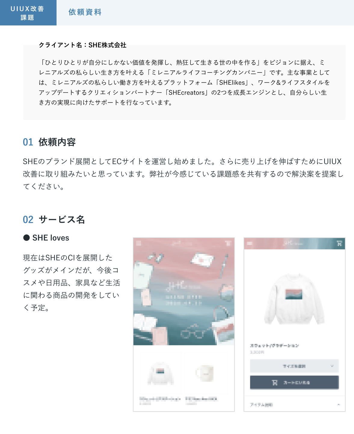 ▼架空のクライアントからの依頼内容を元に、クライアントが感じているECサイトの課題に対してUIUX改善により解決案を提示する。