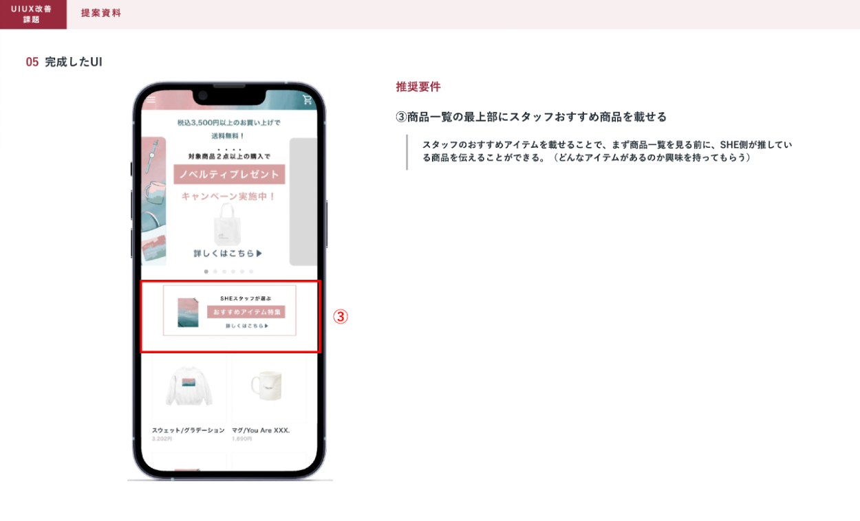・ファーストビューのスライド以外に、商品一覧の最上部にSHE側おすすめの商品を載せる