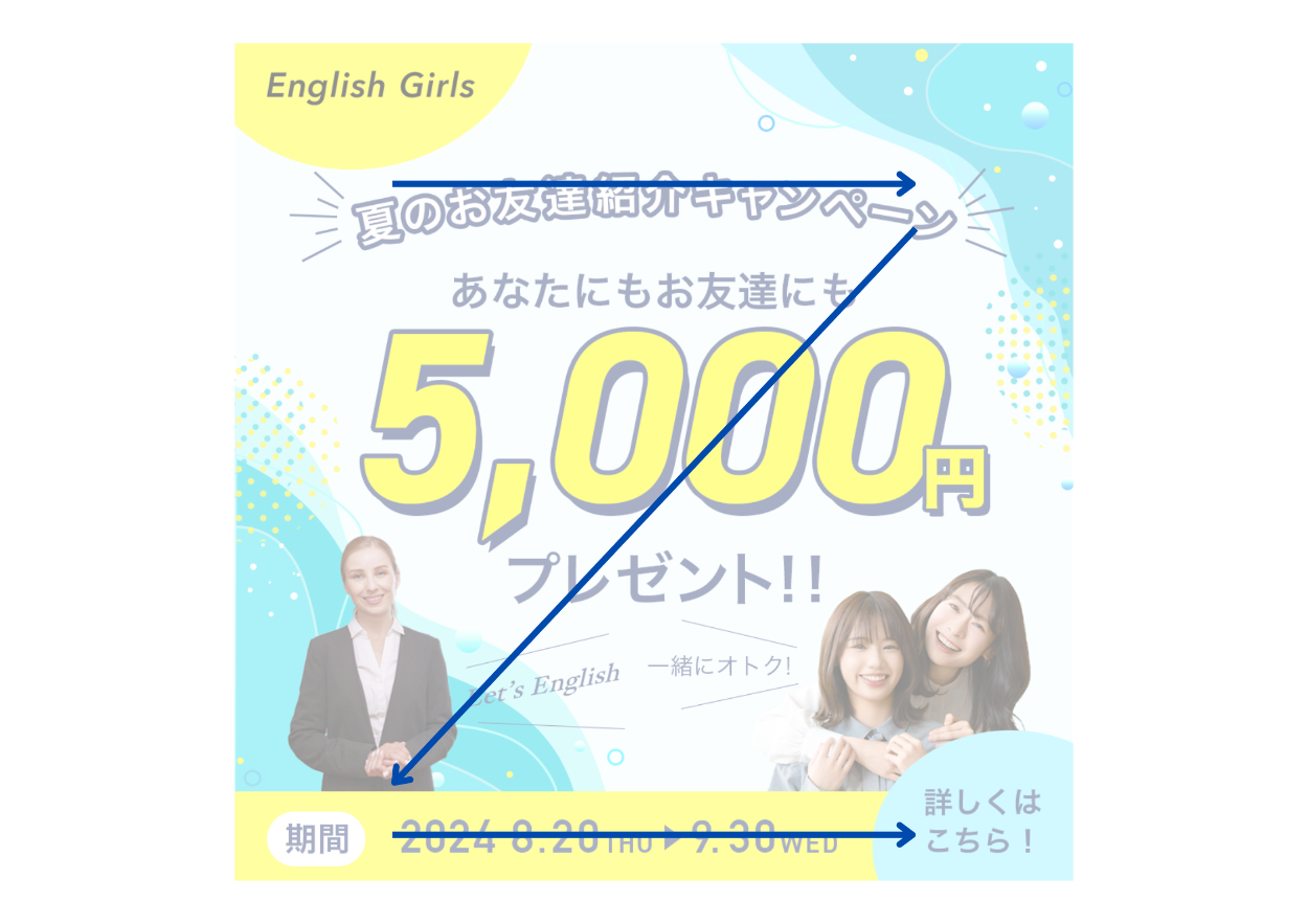 夏のお友達紹介キャンペーンは中抜き文字にしてフォントのデザインを変えることで、文字ごとのグルーピングを意識しました。