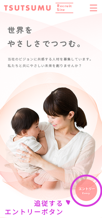 ヘッダーはスクロールに伴い追従する設定としたものの、SPの場合、エントリーボタンを押すのに、ハンバーガーメニューの表示→エントリーセクションへ飛ぶ→エントリーと手順が多くなります。そのため、少ない手順でエントリーできるよう、追従するエントリー単体のボタンを設けました。