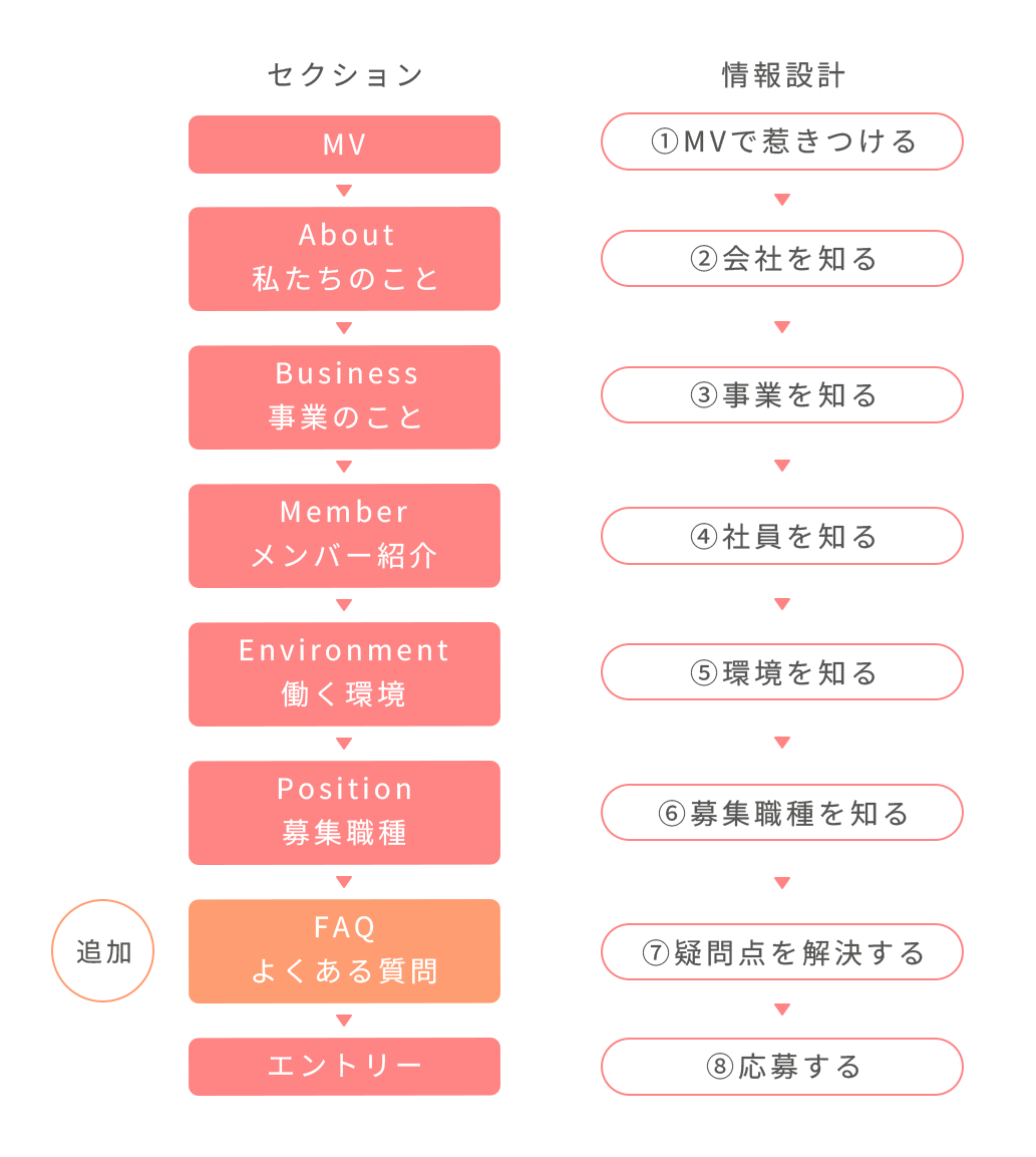 【FAQ:よくある質問】のセクションは必要要件ではなかったが、情報設計を行い必要であると判断して追加。FAQでは、応募者の不安を解消し、疑問点を解決することで、満足度を高め「応募する」という行動を促す。