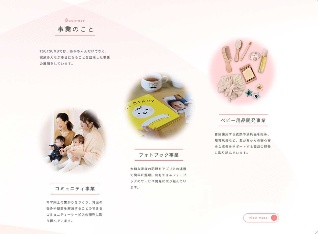 会社の雰囲気を知った後は、何をする会社なのか興味をもつと思われるため、事業を紹介するセクションを配置。