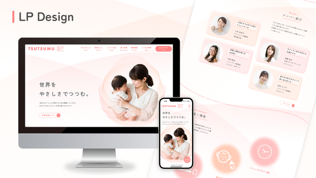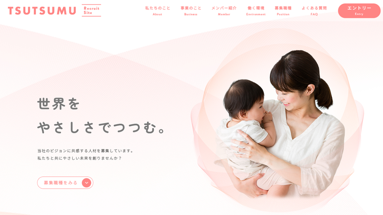 幸せそうな親子の写真をMVに設定。全体的に柔らかい色合いを使用することで、会社の世界観が伝わるように工夫。また、採用サイトであることがわかる文言を表示。
