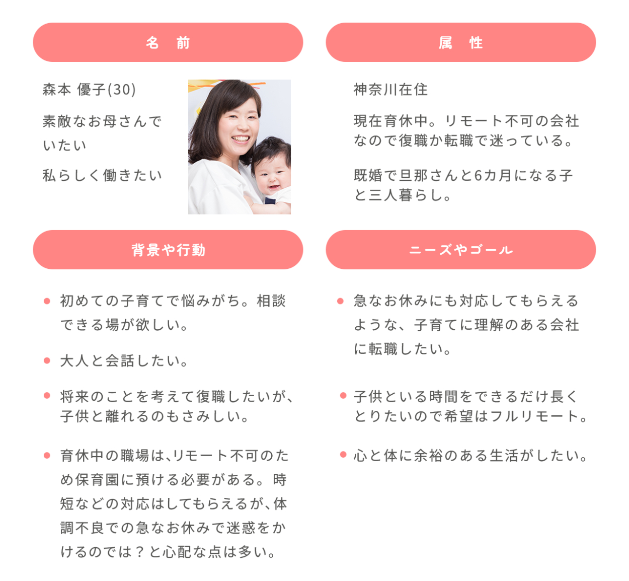 LPを訪れた人が上から順に読み進めたときに、飽きないような配置にしました。設定したペルソナが育児を頑張りつつ仕事をどうするか悩んでいるお母さんだったので、採用サイトではありますが、見て楽しんでもらえるような配置にしました。