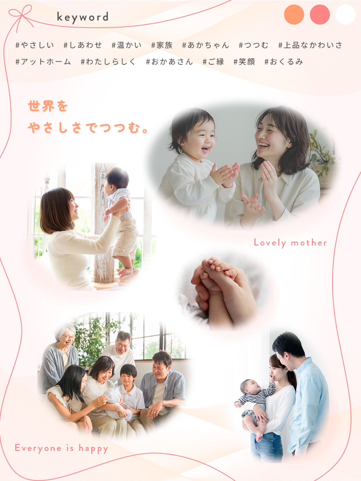 要件とペルソナの情報を踏まえてムードボードを制作しました。「世界をやさしさでつつむ」というキャッチコピーのとおり、優しい雰囲気で包み込むようなデザインをイメージしました。