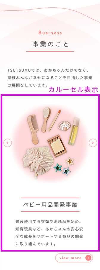 SPではPCで表示していたものを縦並びに表示させることを基本としていますが、「事業のこと」「メンバー紹介」のセクションについては、カルーセルを使用してスクロール量を減らし、最後まで読んでもらえるように工夫しました。