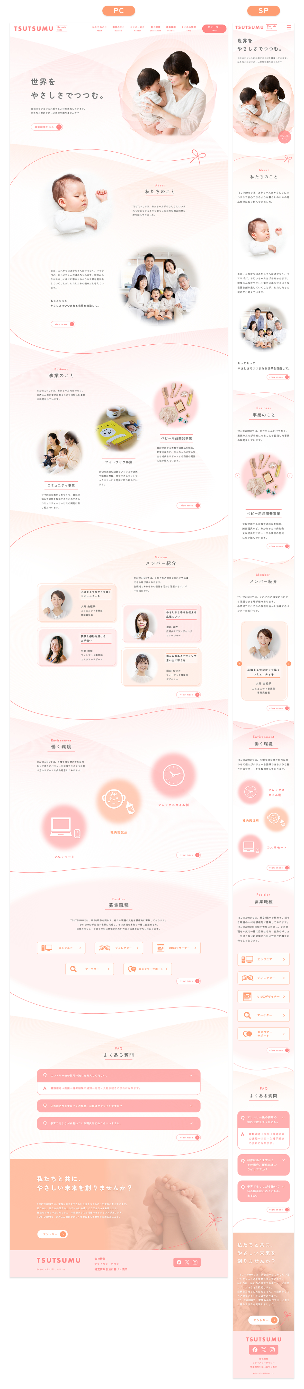 SHElikes MULTI CREATOR CORSEの課題で、架空ベビー用品会社の採用サイトの制作に取り組みました。クライアントからの要件書をもとに、情報を整理・再設計しPC/SPのデザインカンプ~コーディングまで行いました。