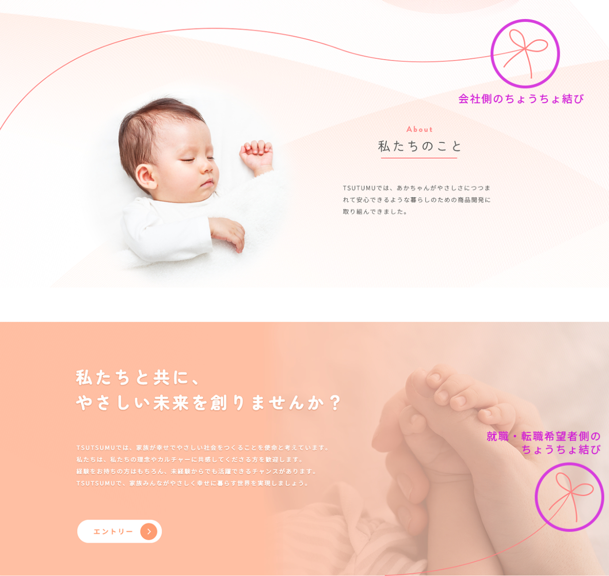 Aboutセクションの右上にあるちょうちょ結びが会社側、エントリーセクションの右下にあるちょうちょ結びが就職・転職希望者側をイメージし、よいご縁で結ばれることを連想させるあしらいとしています。