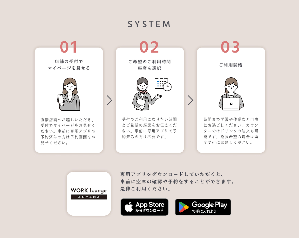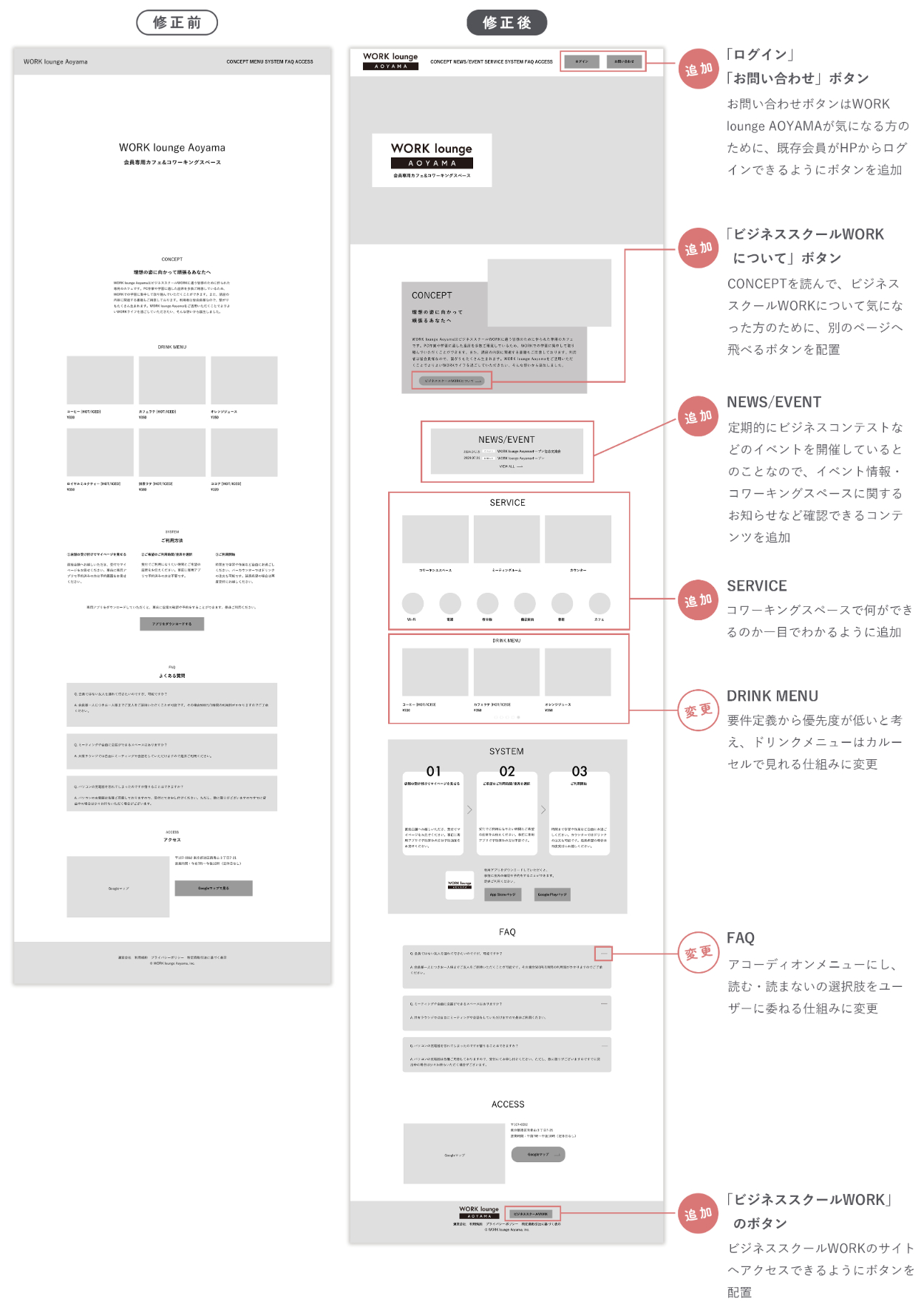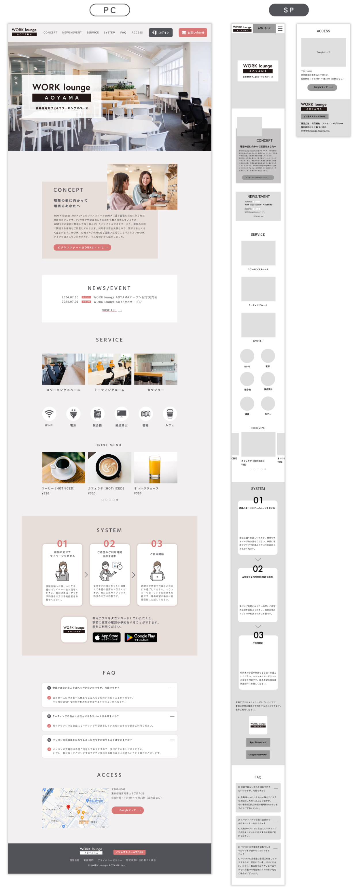 SERVICEのセクションに「WORK lounge AOYAMA」がどういう場所なのか分かるように施設内の写真を挿入しました。