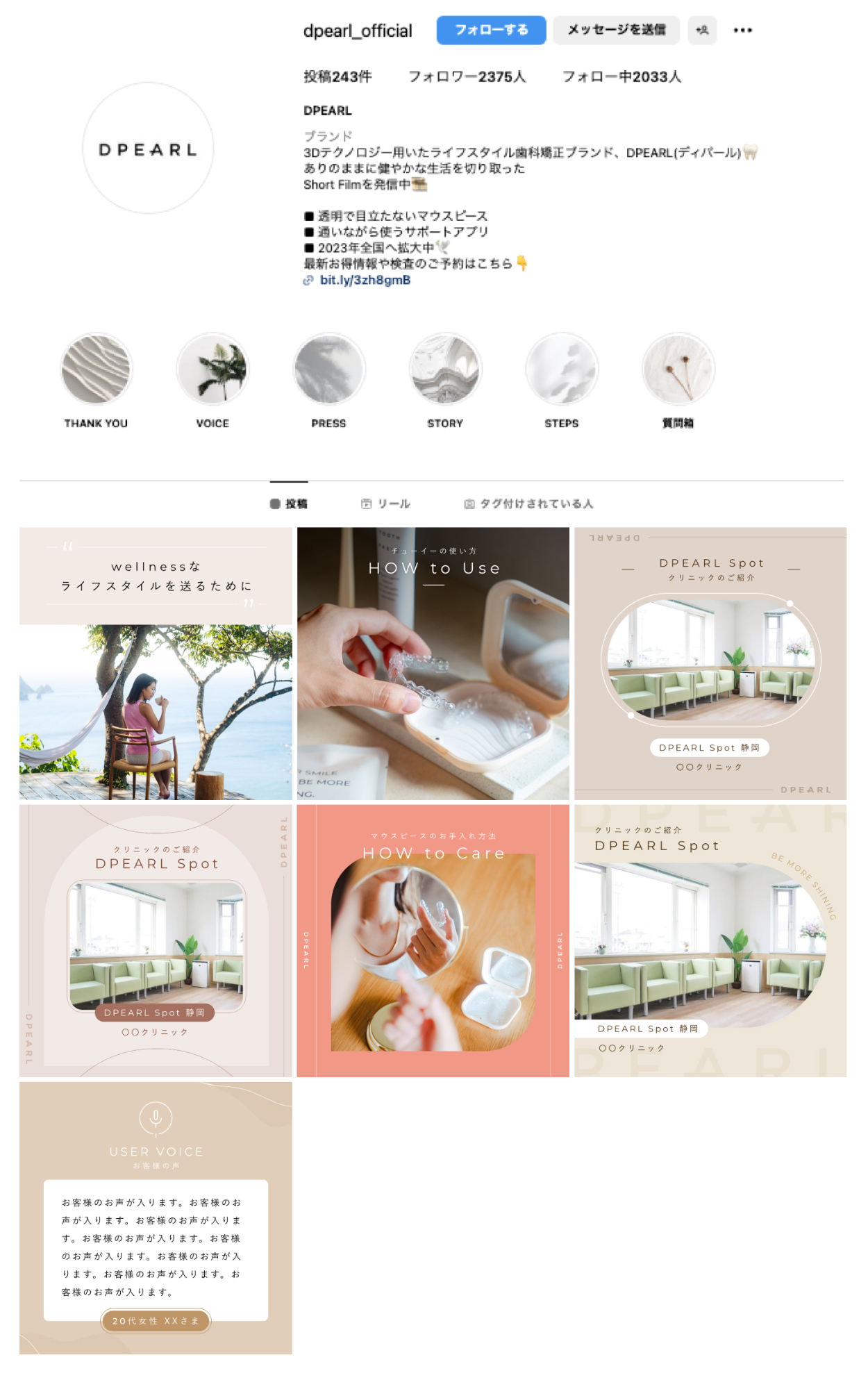 株式会社Philduct様が手掛けるマウスピース矯正ブランド「DPEARL」のインスタグラム投稿デザインを7種作成させていただきました。[制作時間:8時間/制作期間:1週間/使用ツール:XD]