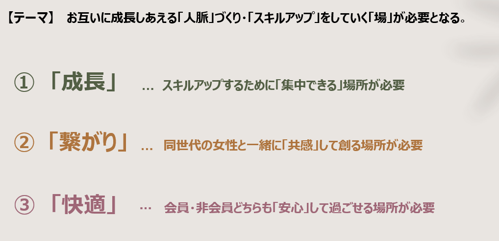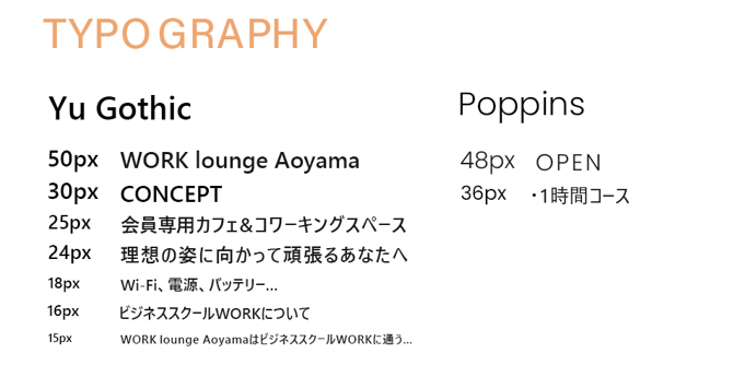 クライアント先の「WORK Lounge Aoyama」について知ってもらうために、全体的の目的を3つのテーマを絞るようにいたしました。