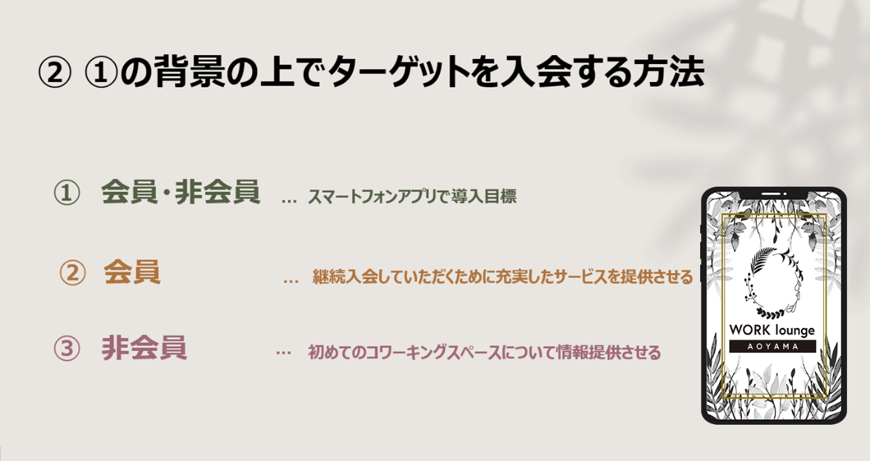 WORK Lounge Aoyamaのご入会していただくために、アプリケーションのダウンロードをしていただくように紹介をする。