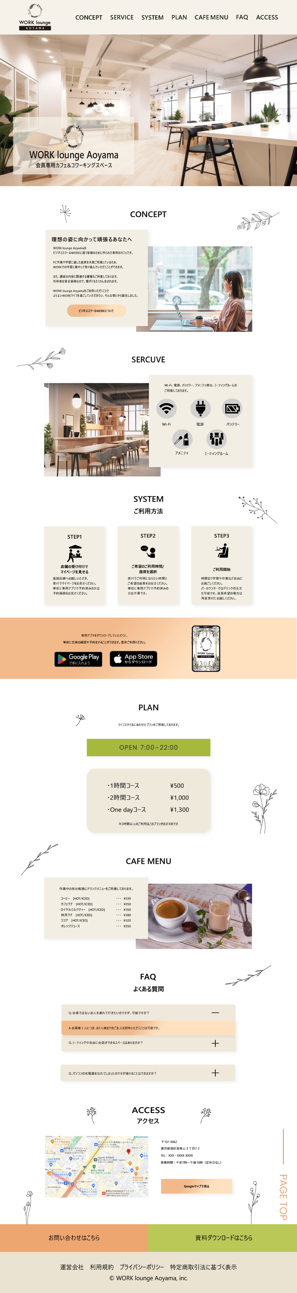 ◆目的:会員様限定のカフェ&コワーキングスペースをオープンすることになり、利用方法やアクセス情報を載せたWeb サイトを制作したい。/ WORK lounge Aoyama について知ってもらいたい。