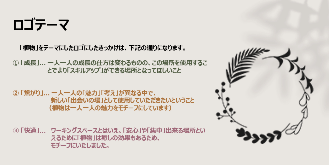 ロゴテーマにそろえて、1人1人の「美しさ、華やかさ、魅力」をお客様に例えるように装飾いたしました。また、コワーキングスペースの周りには、植物を置いてナチュラル・癒しな雰囲気で集中してスキルを高めていただけるようなメッセージを込めて、装飾いたしました。