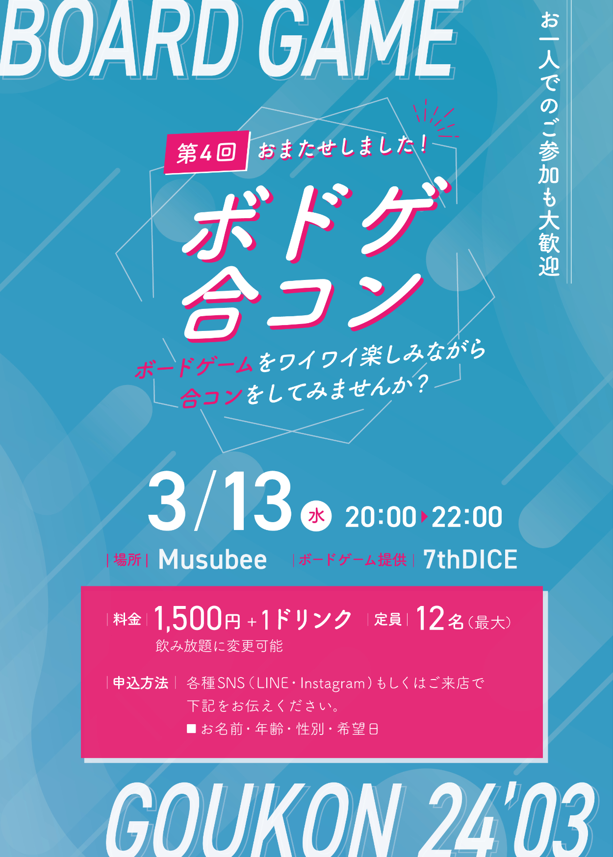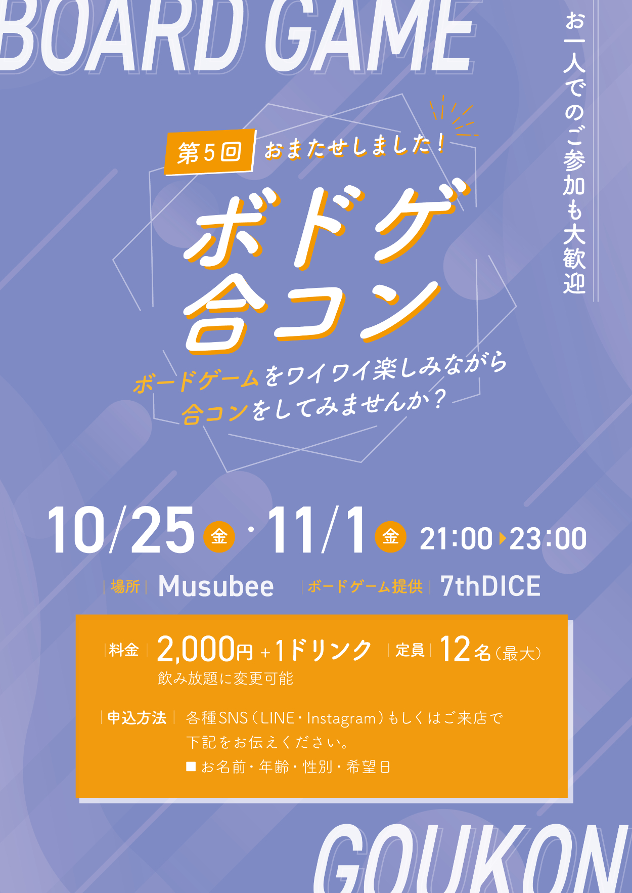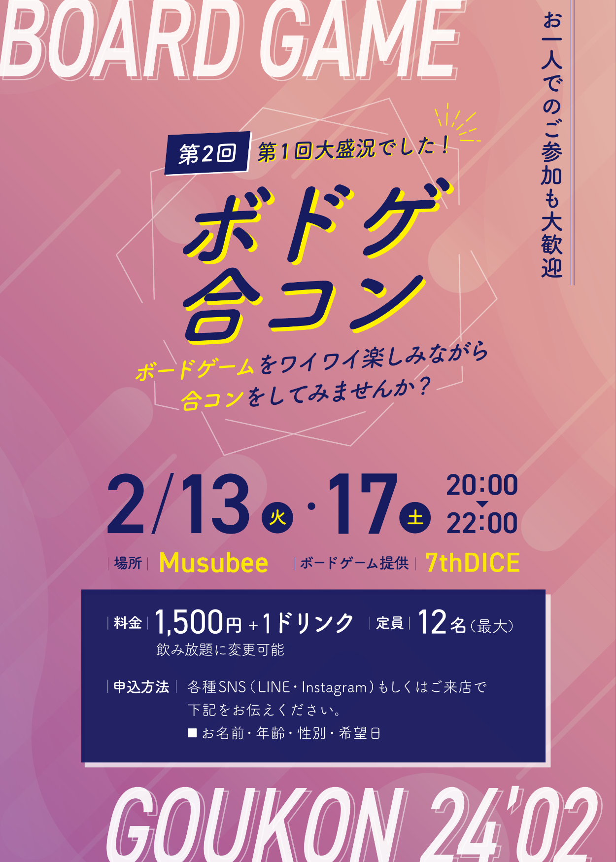 - イベントタイトル(ボドゲ合コン)と日付がすぐに目に入るよう中央に大きく配置しました。