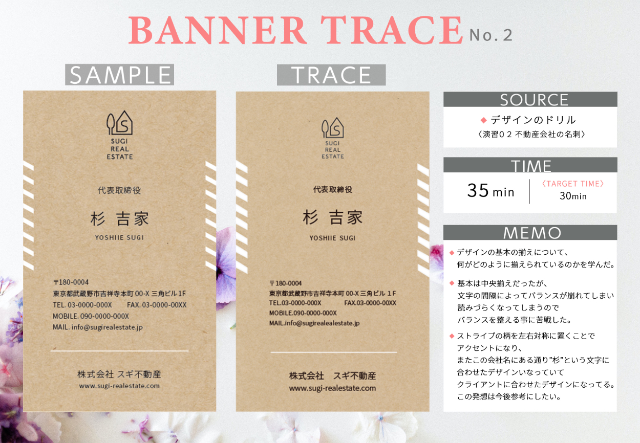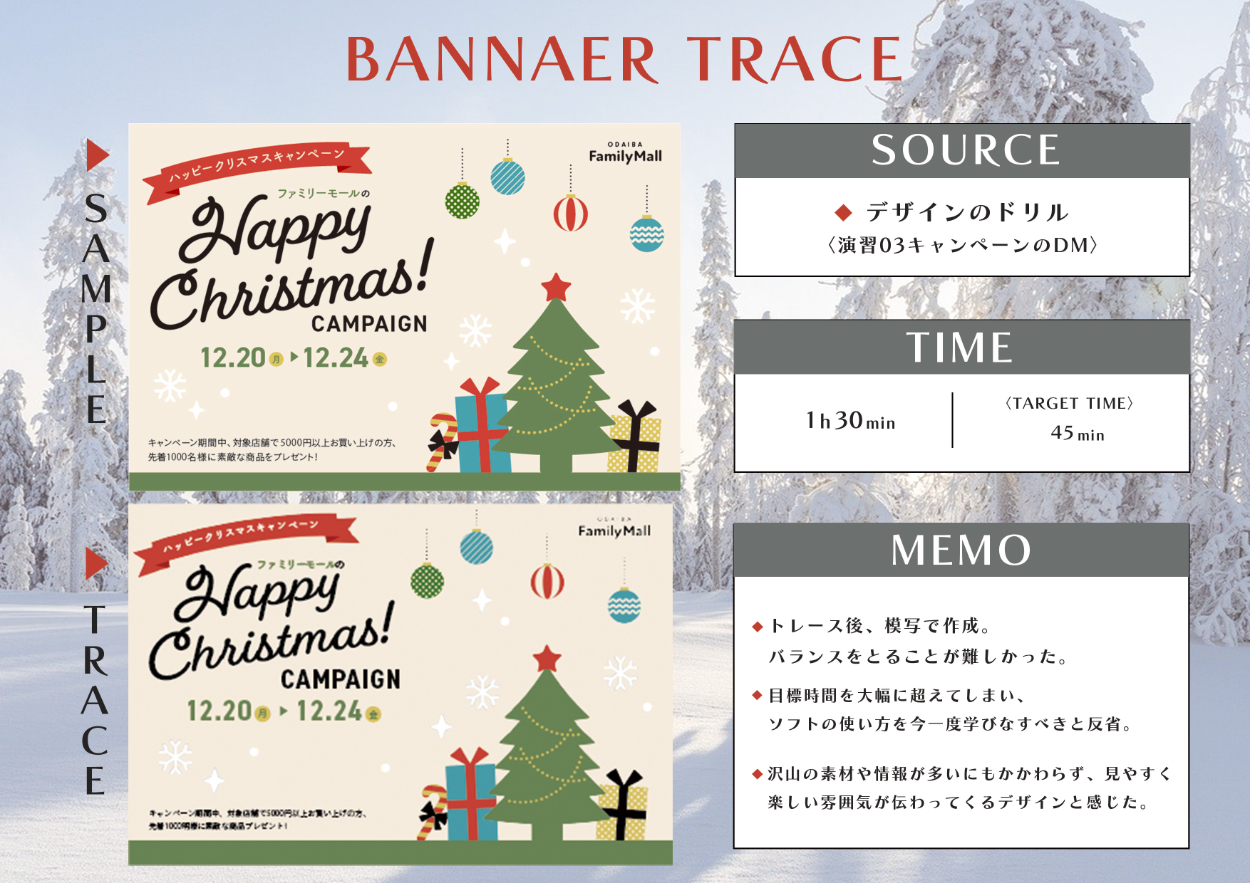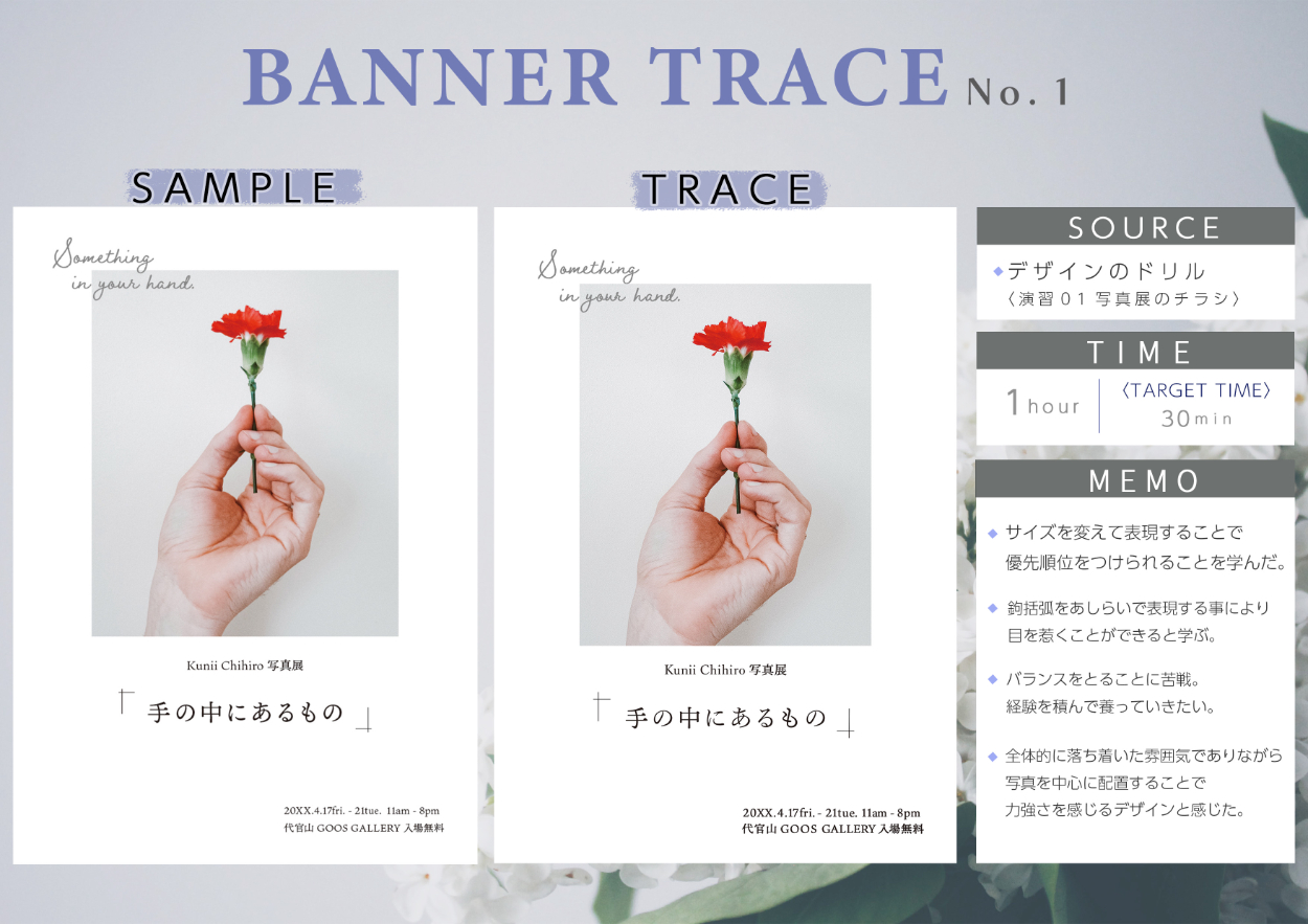 デザインの基本を学ぶ事とツールの使用方法を使いこなす為バナートレースをしました。 それぞれ学んだこと、参考になったことを一つ一つまとめています。 使用元は〈トレース&模写で学ぶ デザインのドリル Power Design inc著〉です。