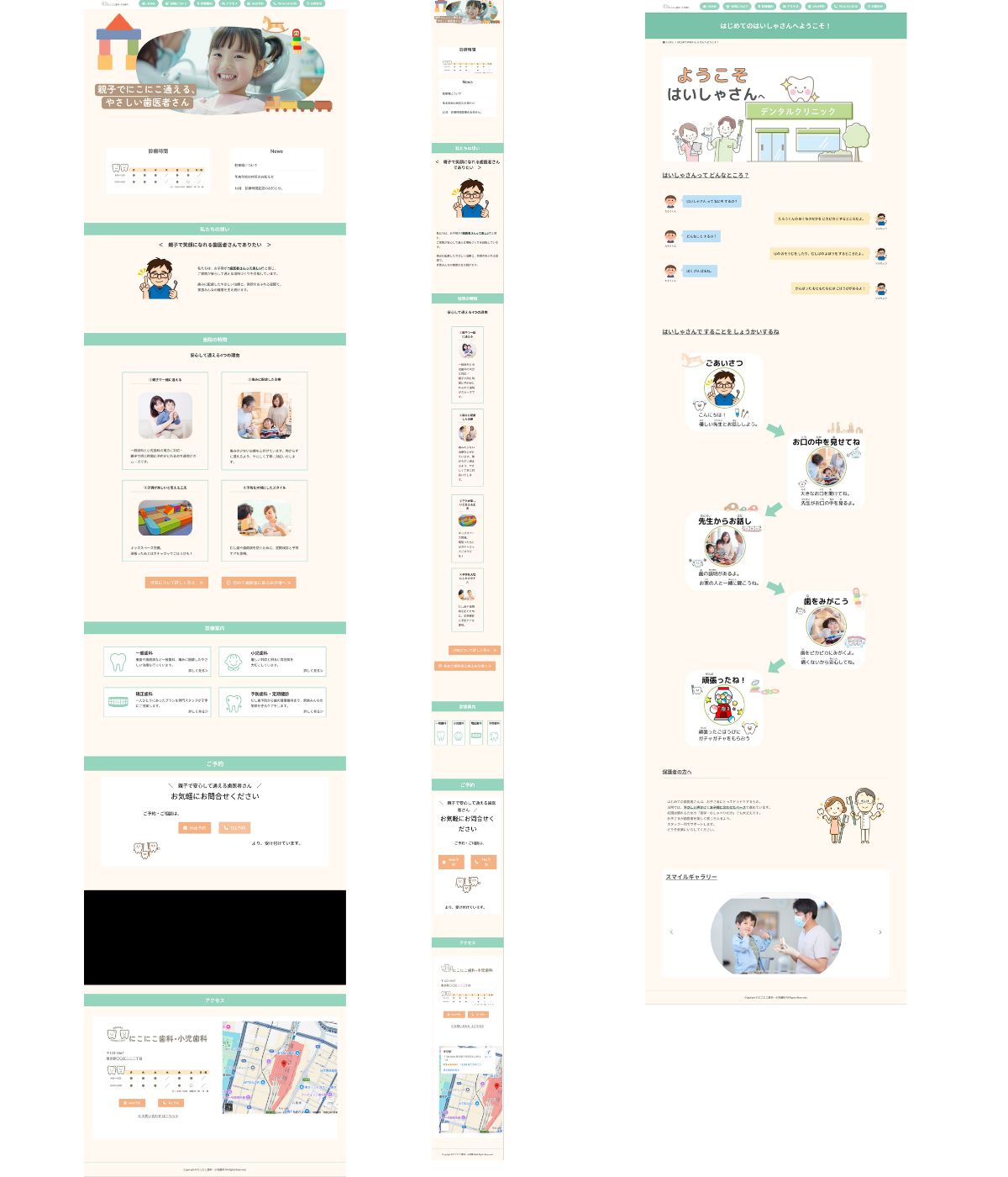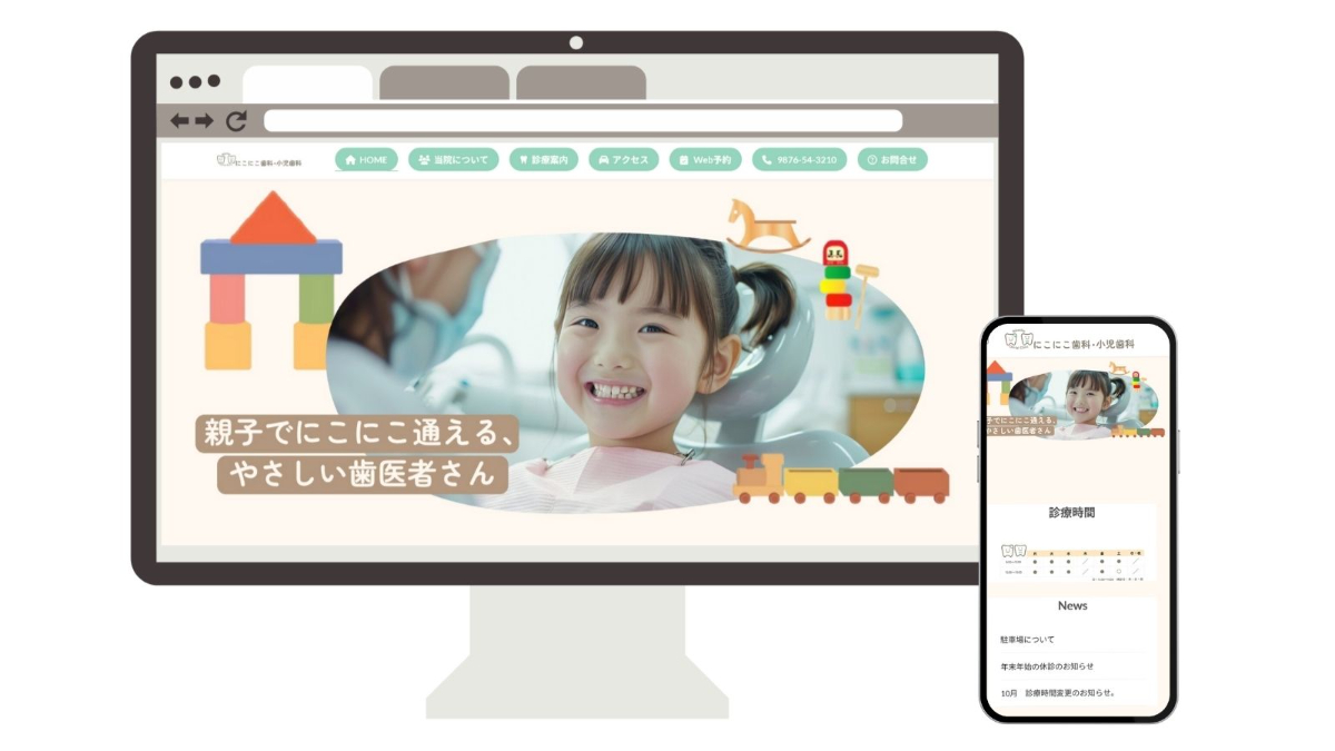 歯科医院特有の緊張感を和らげるため、パステルカラーを基調とした配色と角丸デザインを採用しました。小児歯科のやさしさと、医療機関としての信頼感の両立を意識し、