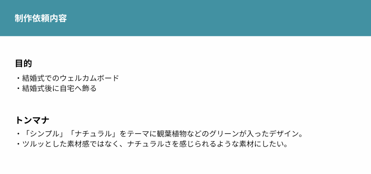 ナチュラル感の中にも高級感がほしい、特別感がほしいとのことだったので金色を採用。グリーンも高級感のある深みがある素材にしました。