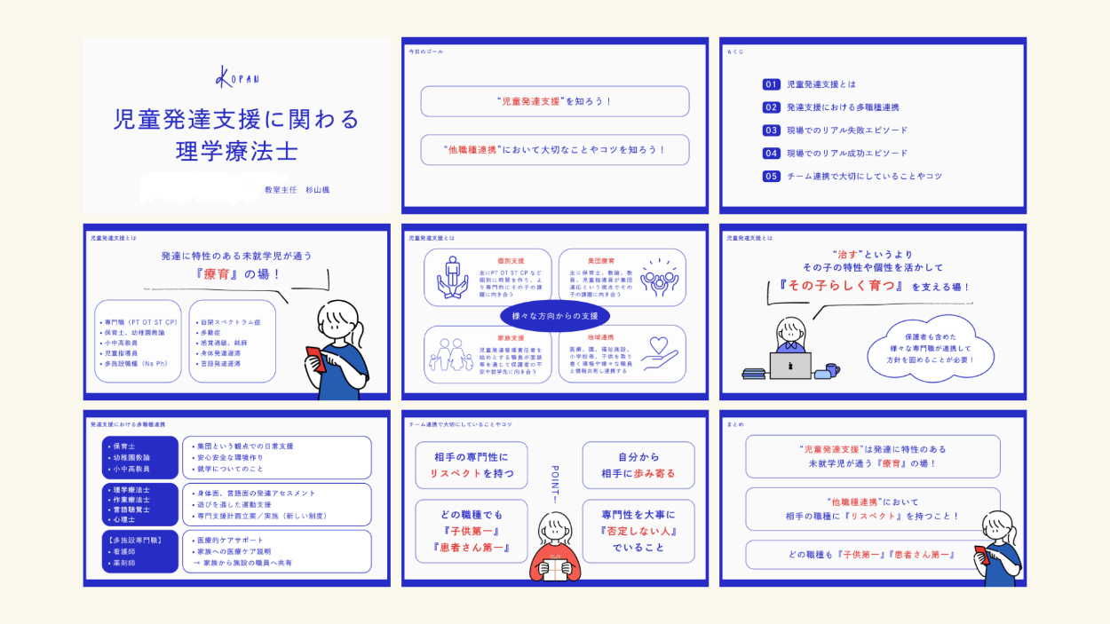 大学で、医療系学生や保育学生に向けて行われる他職種連携教育の講義用スライドを作成しました。作成スライドは当日の講義用の資料として使用しました。