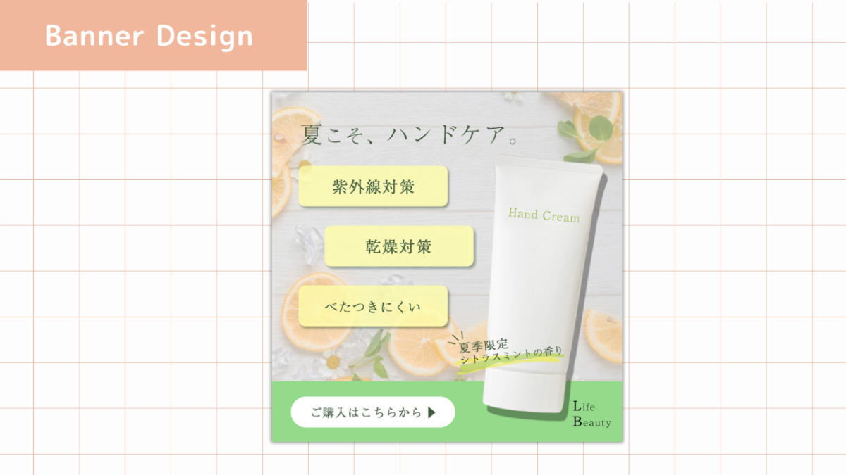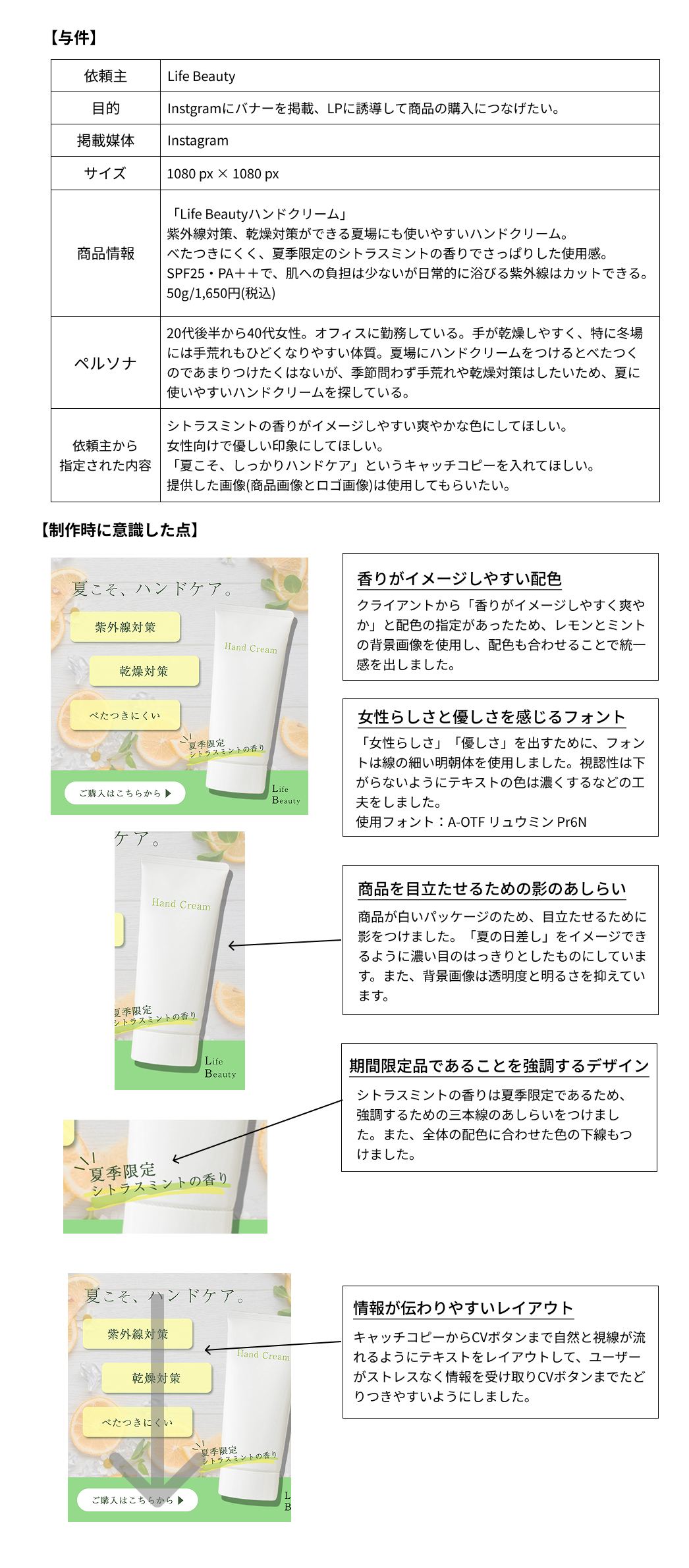 【架空案件】ハンドクリームのLP誘導バナー Onishi|おおにし Webデザイナー OVERVIEW 自作の架空案件をもとにハンドクリームの商品紹介バナーをPhotoshopで制作しました。 YEAR 2025