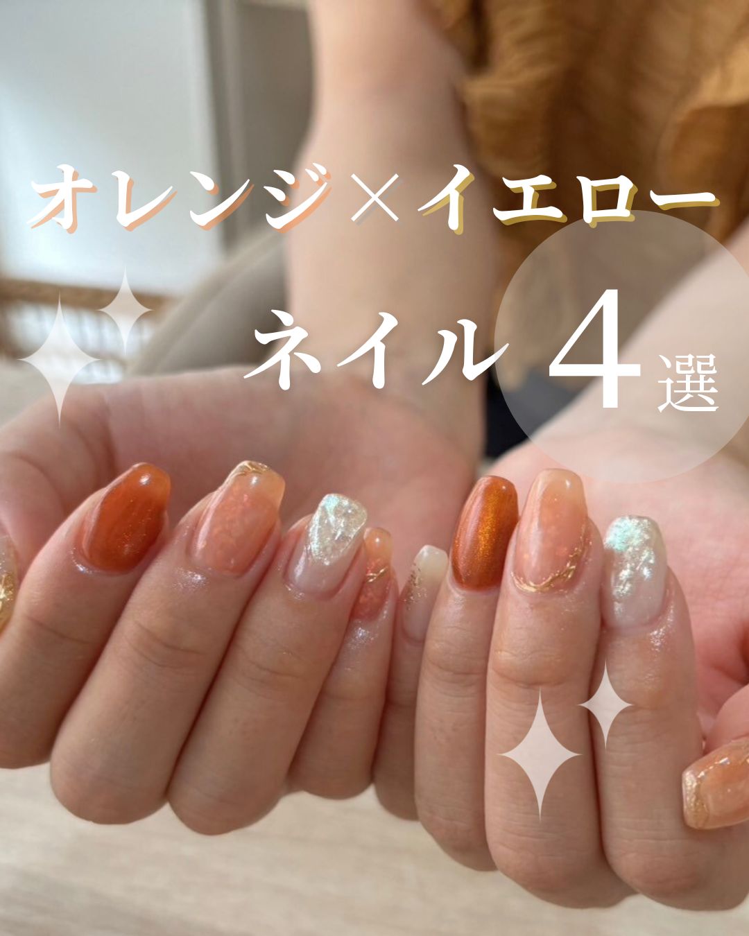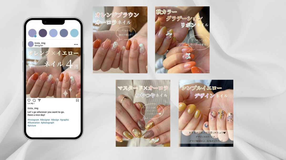 ネイルサロンCil様の公式Instagram投稿するバナーを制作しました。 『おすすめのオレンジ×イエローネイルデザイン』をテーマに、構成〜イラスト選定〜デザインを行いました。