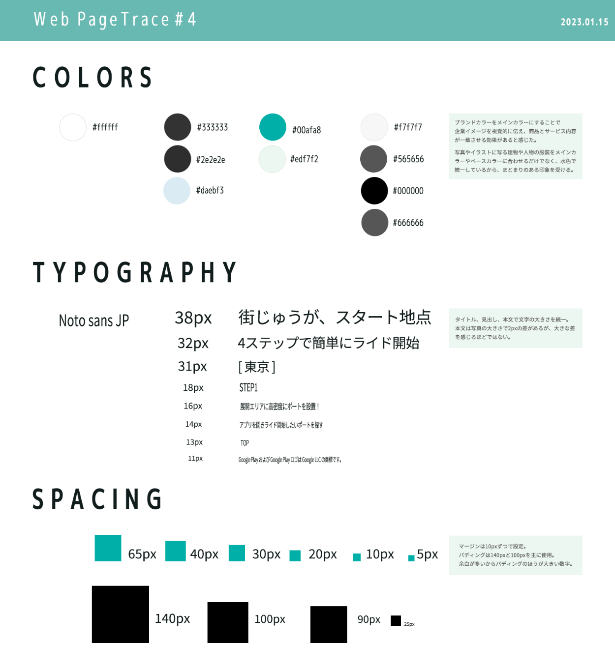 一見、同じ色に見えても若干の違いがあることや余白や文字の大きさ、繰り返し同じ装飾が使われてるため、イラストや写真が挿入されていてもユーザーが情報を視覚的に得やすい設計になっていることがわかり、すっきりとしているHPほど開発ツールを開かないと気づかない工夫がされていることを学んだ。