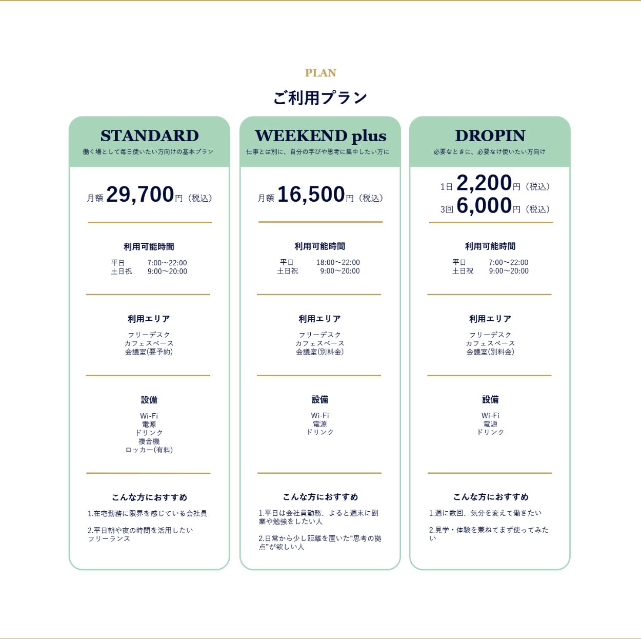 ・ユーザーが一番気になるのが料金設定かと思ったので、一番目立つように配置。そのほかもプラン同士で比較しやすい配置に。