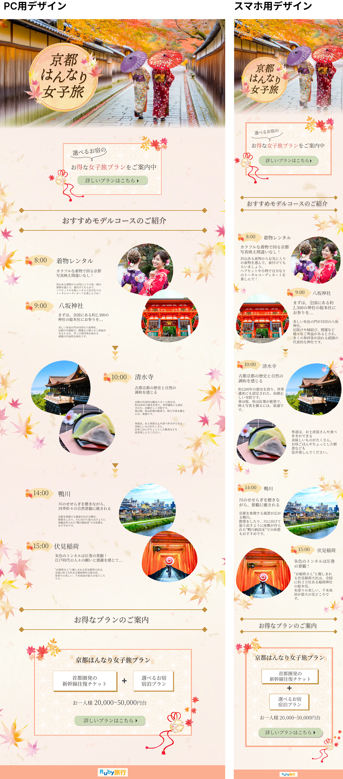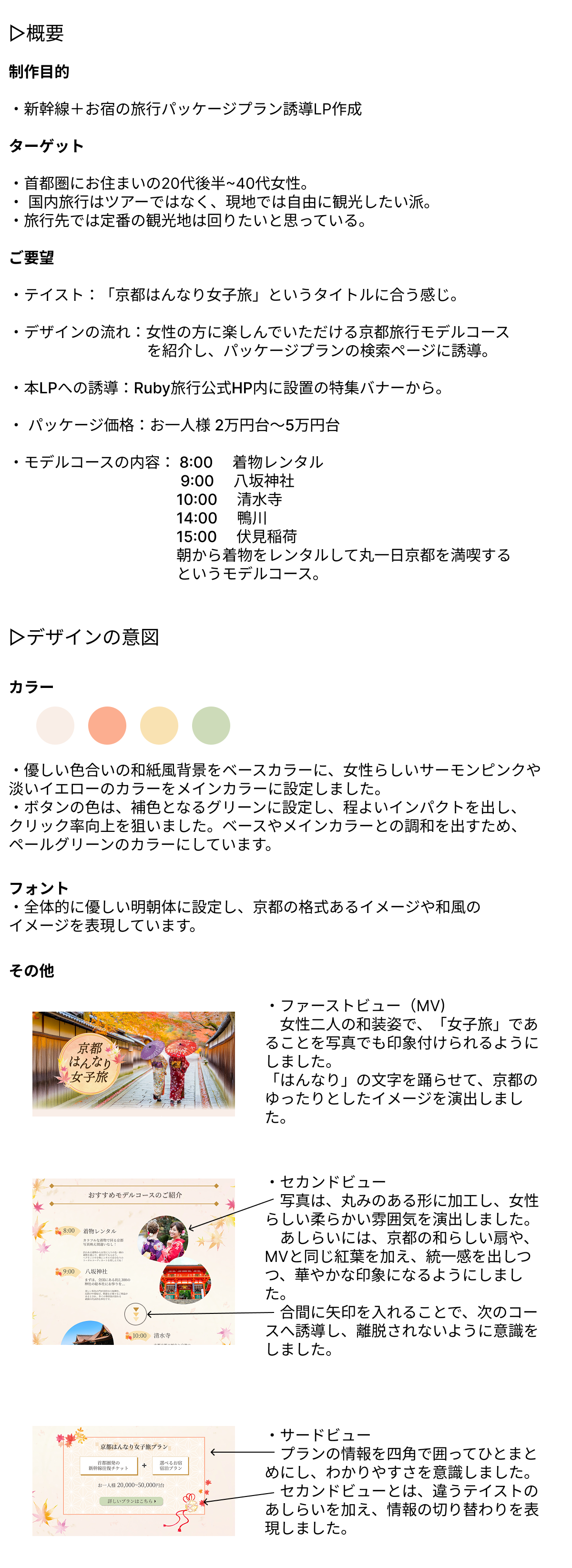[架空案件] 旅行パッケージプラン誘導LP Chihiro.H Webデザイナー OVERVIEW Webデザインスクール「HerTech」様の勉強会で作成したPC用とスマホ用のLPデザインです。 YEAR 2025 ▷制作物作成ツール:Photoshop(MVのみ)、Figma