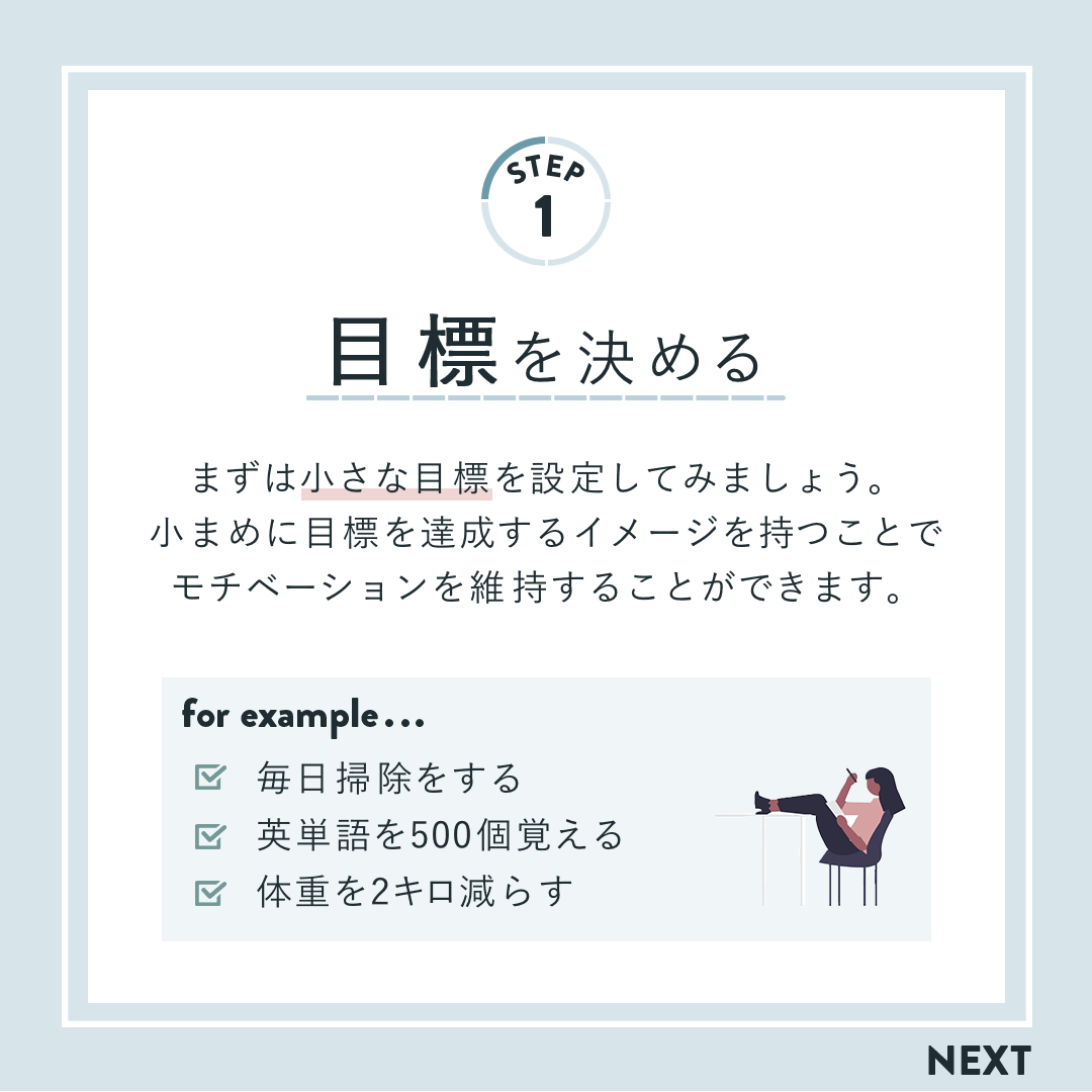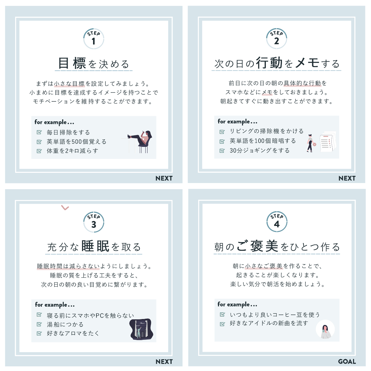 - Instagram掲載バナーとして最後まで読み進めていただけるよう、表紙を除く1〜3枚目には右下に「NEXT」のあしらいをつけました。最後のページには「GOAL」のあしらいをつけ、読んだ達成感と意外とすぐできそう!という印象を与えられるようにデザインしました。