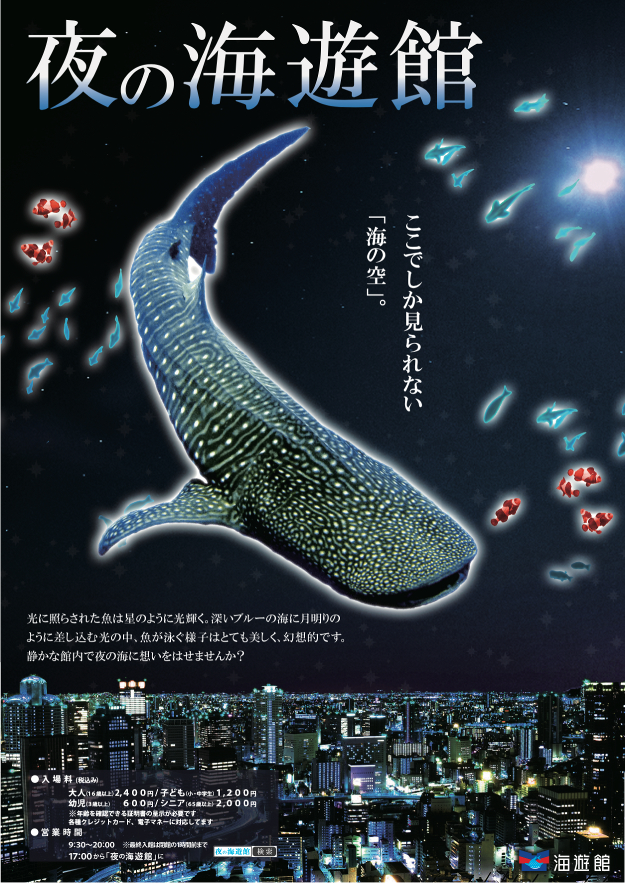 まず、背面を夜景にし、魚を光らせて星に見立てジンベイザメを真ん中に海遊館の印象を残しました。全体的にクリアにし、神秘的な美しさというコンセプトだったのでコンセプト通りの作品になりました。背景の街を青系にすることにより、魚と一緒の空間にいても違和感を無くしました。