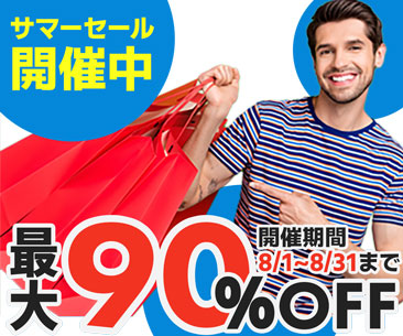 サマーセールバナー たかほし みつと webデザイナー このバナーは鮮明な色と活動的なデザインが特徴です。笑顔のモデルと「最大90%OFF」の大胆な文字が購買を刺激し、緊急性を高める期間限定セールをアピールしています。
