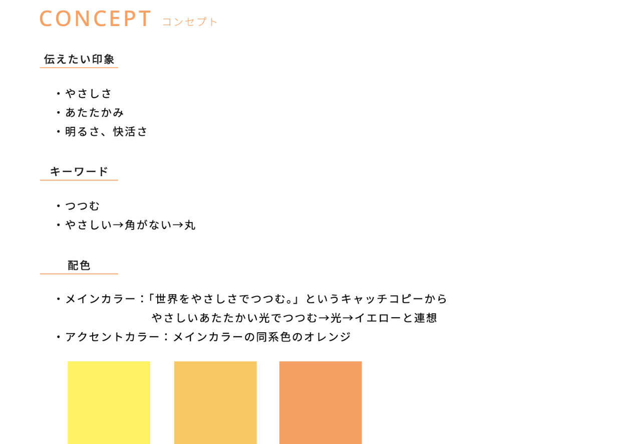 - コンセプト設定で決めた伝えたい印象である「やさしさ」、「明るさ」を表現するために暖色のイエローとオレンジを使用しました。