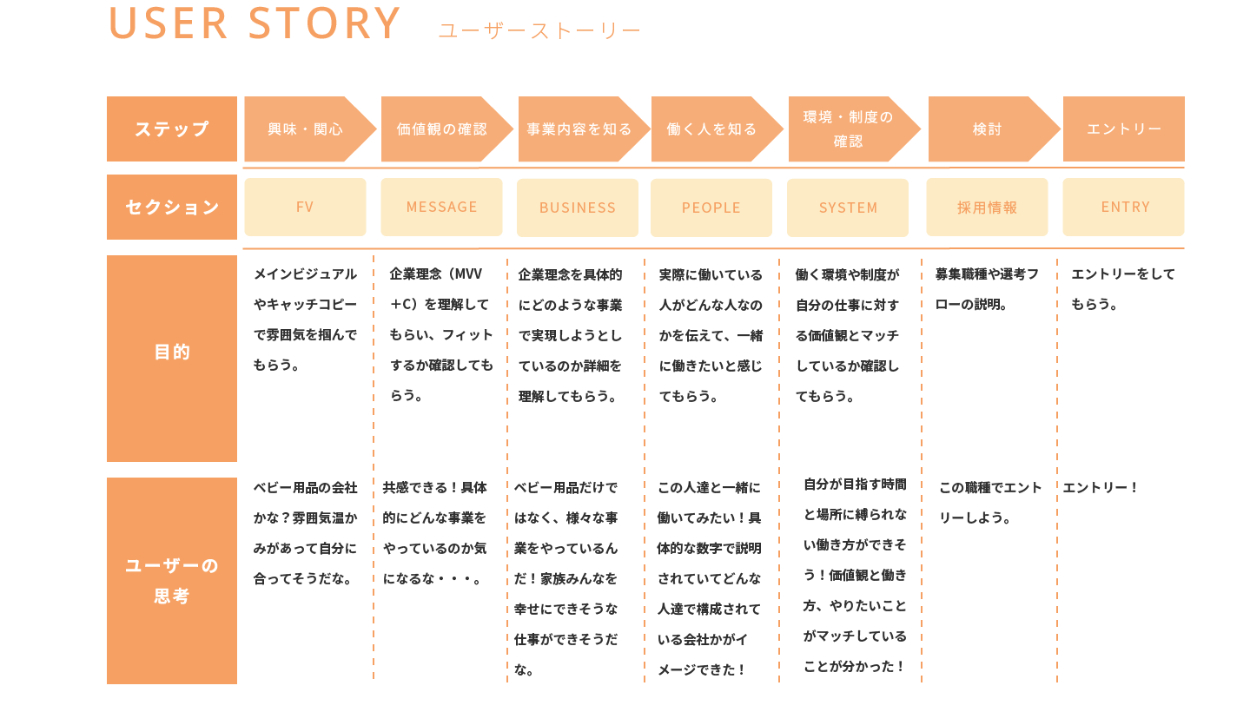 LP制作の目標・ゴール、ペルソナ設定を元にユーザーストーリーをカスタマージャーニーマップを作成し、情報設計を行いました。
