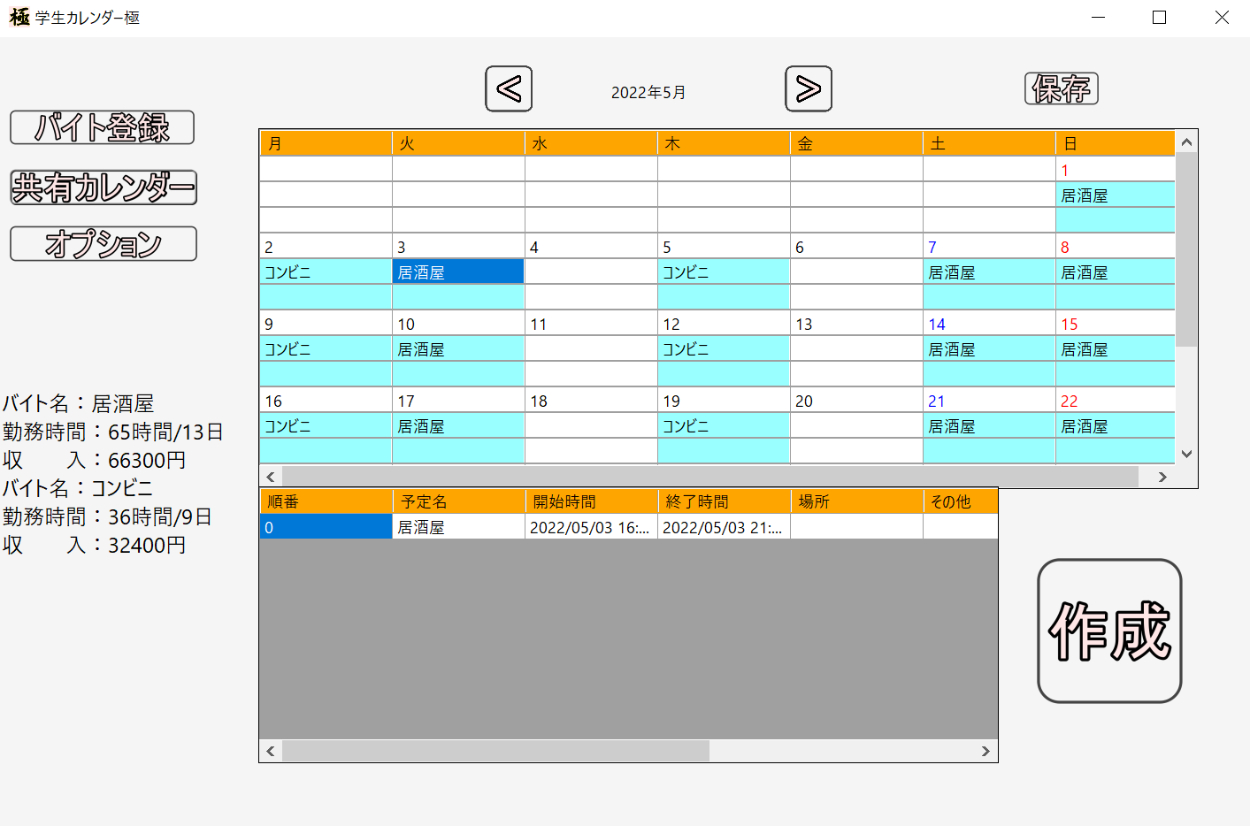 学生カレンダー極 Hayato Fujioka 専門学生 OVERVIEW 2021-2022年神戸電子専門学校ソフトⅡコースチーム制作課題作品 プログラム担当 アプリ名:学生カレンダー極アプリの概要学生に特化したスケジュール管理アプリ。予定の入力の他にアルバイトの名前と時間も入力できます。各月ごとにアルバイトの総時間と給料を表示させ、掛け持ちの場合でも分けて表示されるのでアルバイト調整をしやすくなっています。本製品はcsvファイルにデータを保存するため、はじめての方は空のcsvファイルのご用意をお願い致します。言語:C#▼実行例▼ダウンロードURL
