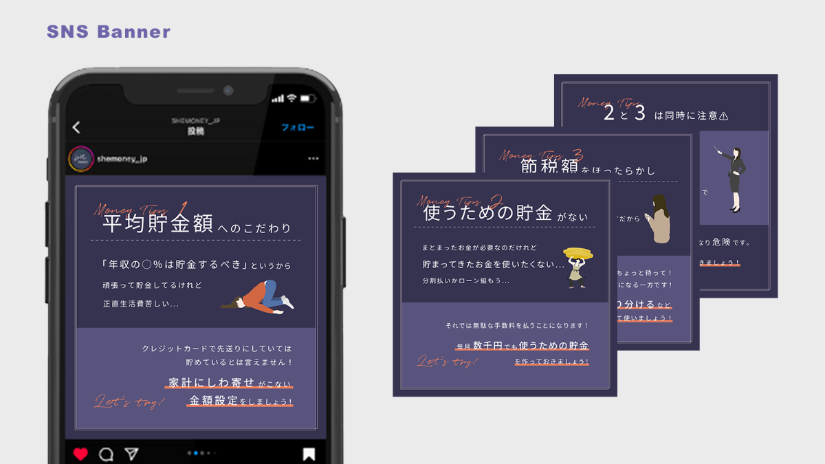 SHEmoneyのInstagramで掲載する用のクリエイティブを制作いたしました。(使用ツール:Photoshop)(サイズ:1080×1080)