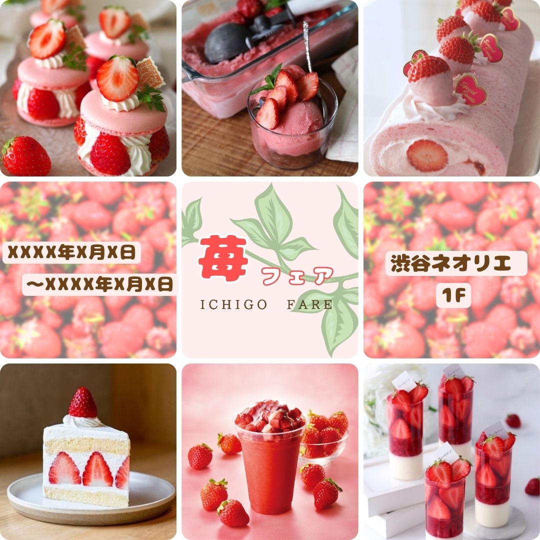 苺フェア kou_saki_dyuku_masha webデザイナー OVERVIEW 架空イベントのインスタ用広告バナー フェアということでいろいろな種類の苺スイーツ・ドリンク画像を添付区分けをすることで見やすく種類が豊富なこともアピール