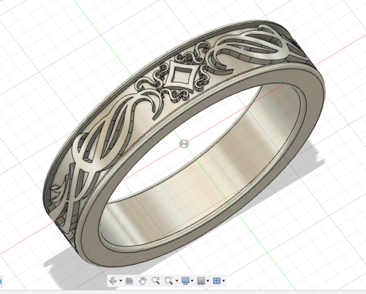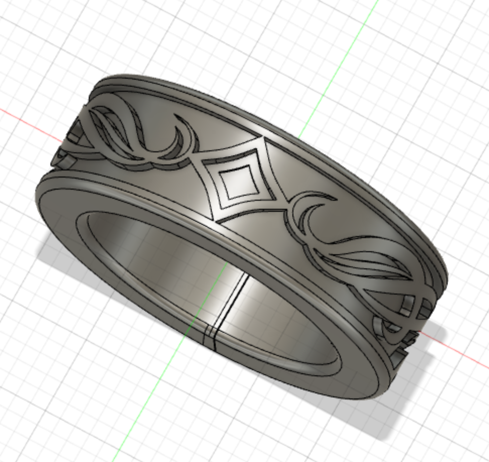 fusion360で制作した指輪です。 3Dモデルを3Dプリンターで出力して、色々と加工をするとシルバーリングが作れると聞いたので、作ってみました。 1枚目は3Dプリンターで出力した際、真ん中の細かい模様が潰れてしまったため、2枚目の画像のような少し簡素なデザインにしました。