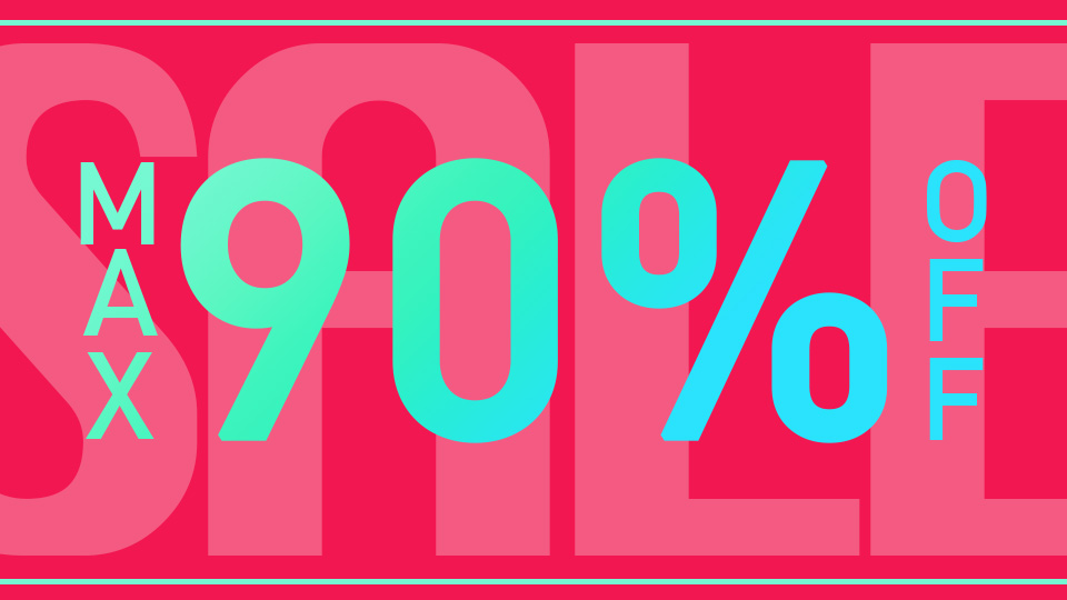 ・デザインに関して:色に関しては濃いピンクの背景を敷いて目をひくことと「MAX90%OFF」の文字は補色の色をグラデーションにすることでのっぺり見えないようにしました。「SALE」の文字を背景にしてインパクトが出るようにしました。上下に線を入れることで引き締まって見えるようにしました。