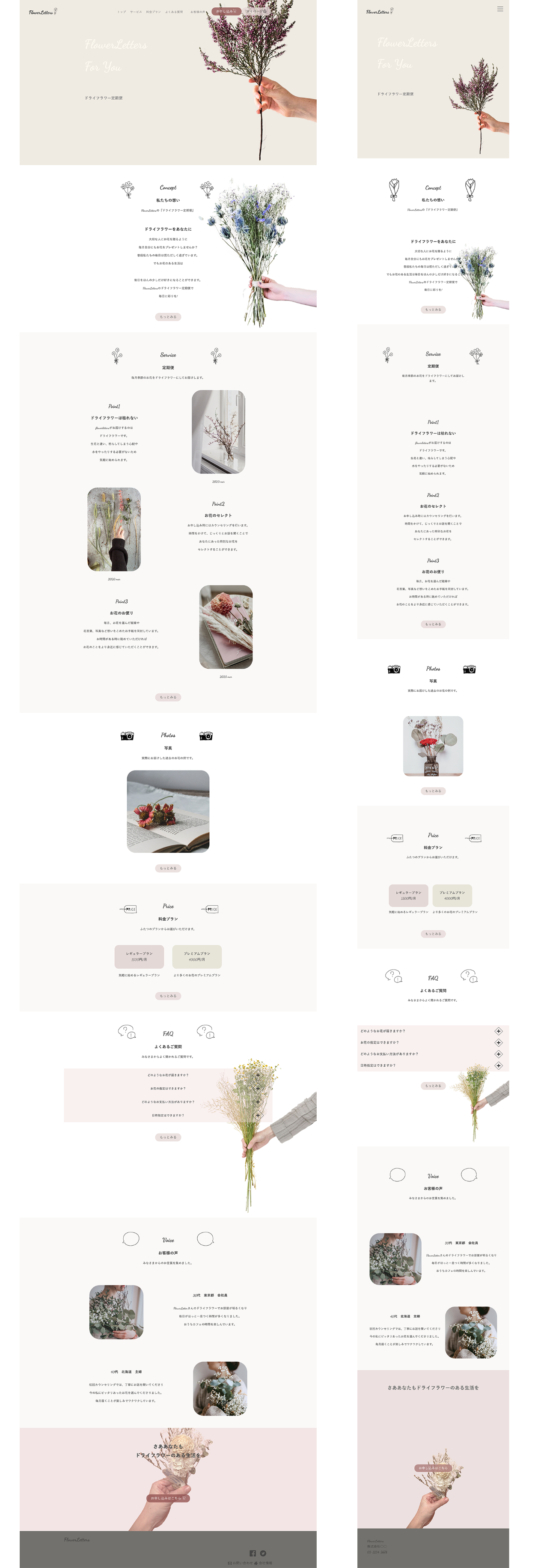 架空のドライフラワー販売会社の新商品『ドライフラワー定期便』のLPを作成しました。 今回LP制作の依頼を受けたという設定で、LPの企画、情報設計、photoshopでのデザイン作成、コーディングを一貫して行いました。スクールでの課題として作成しました。