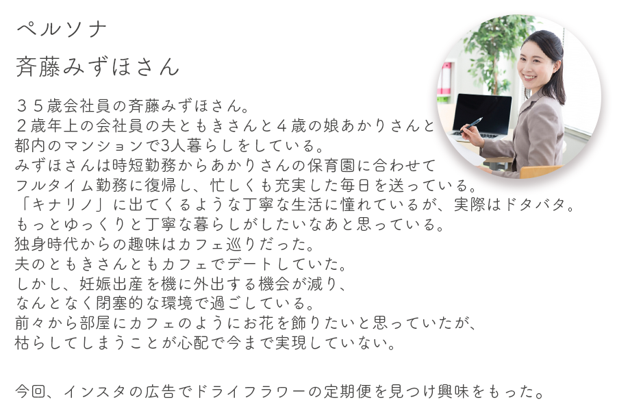 架空のドライフラワー屋さん。主にネットで単品を販売していたが、今回新しくドライフラワーの定期便のサブスクを始めた。毎月ドライフラワーが届く仕組みとなっている。