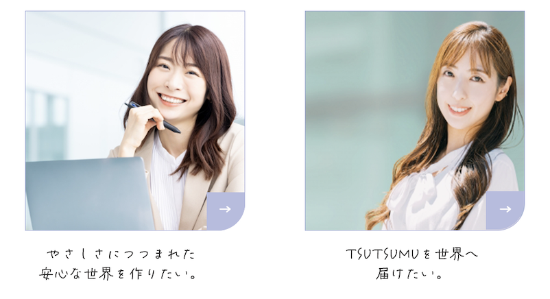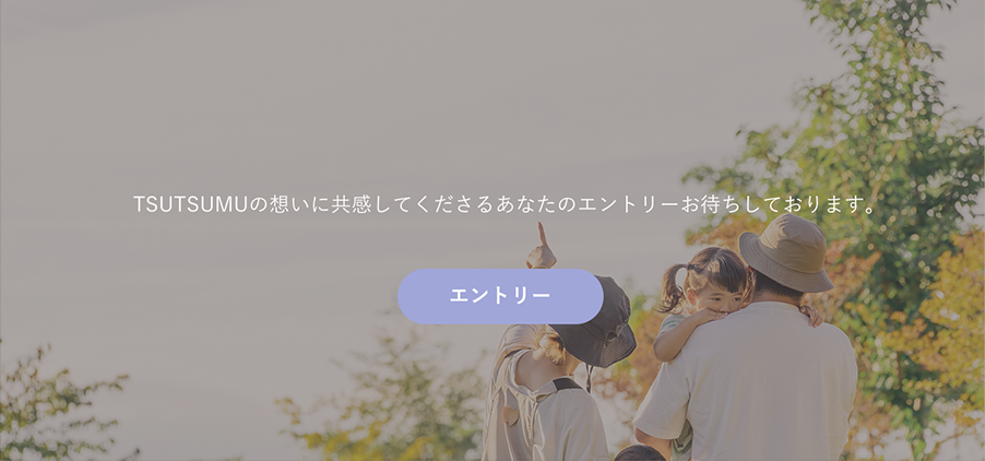 特に最後のエントリーボタン前の”TSUTSUMUの想いに共感してくださる方からのエントリーをお待ちしています”という部分の背景画像の部分には女性が何かを指している写真を使用し、同じ想いに向かっていきましょうという想いが伝わるようにしました。