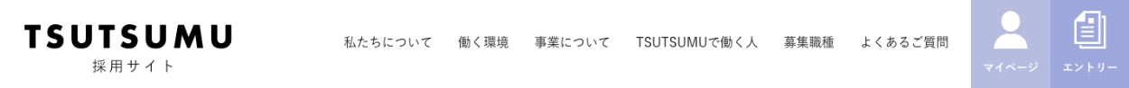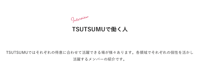 必要要素の中に”メンバー紹介”とあったのですが、採用サイトにメンバー紹介という文言がミスマッチだと考え、”TSUTSUMUで働く人”と文言を変更しました。このようにすると、求職者側から見ると親しみやすさを感じてもらい、その先に進んでもらえるようにしました。