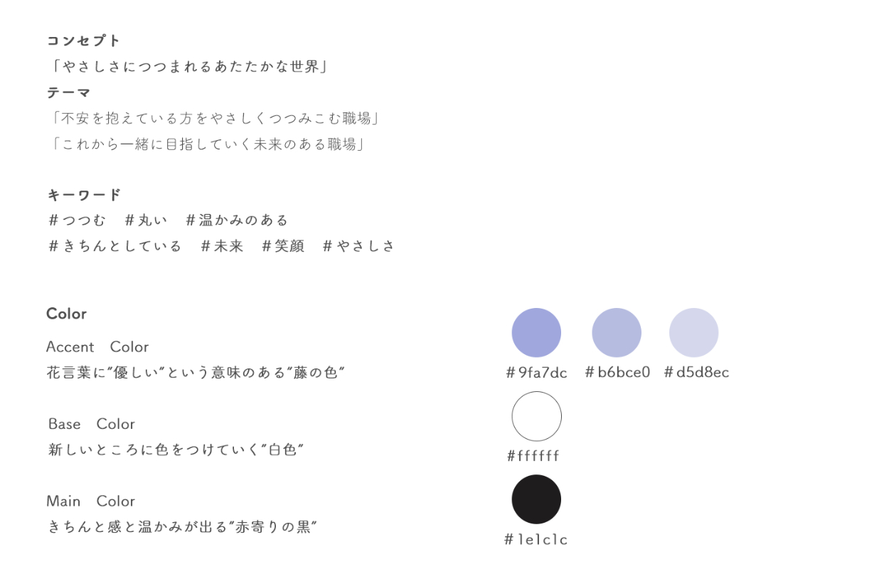 その後、コンセプトやテーマ、キーワード配色等を以下のように考えデザインを製作しました。