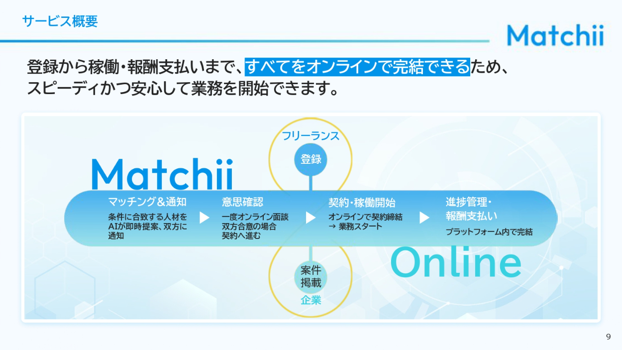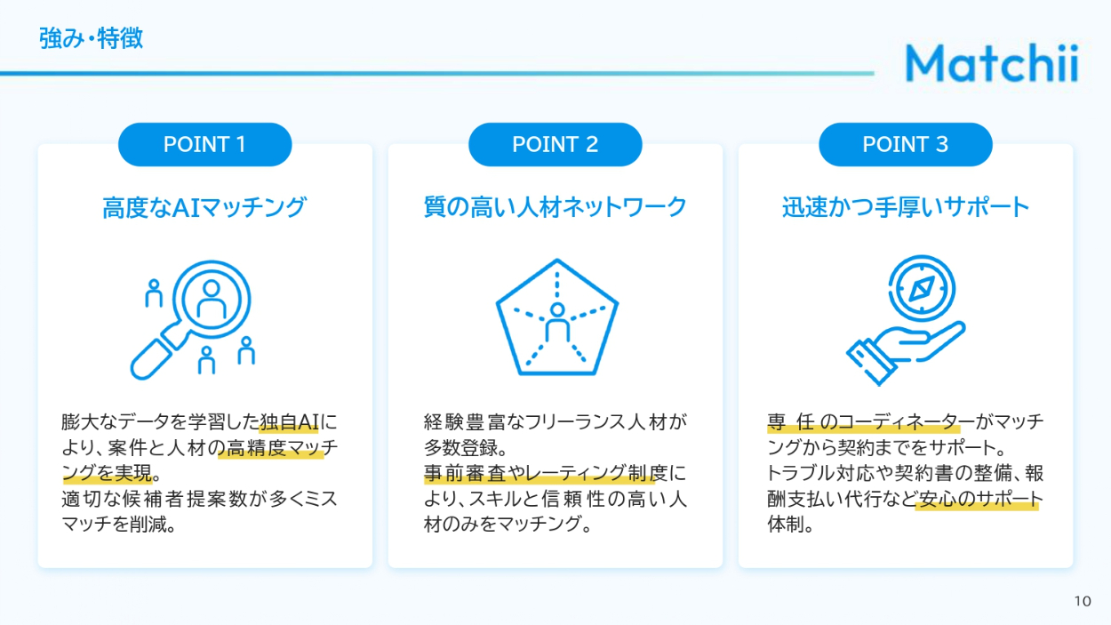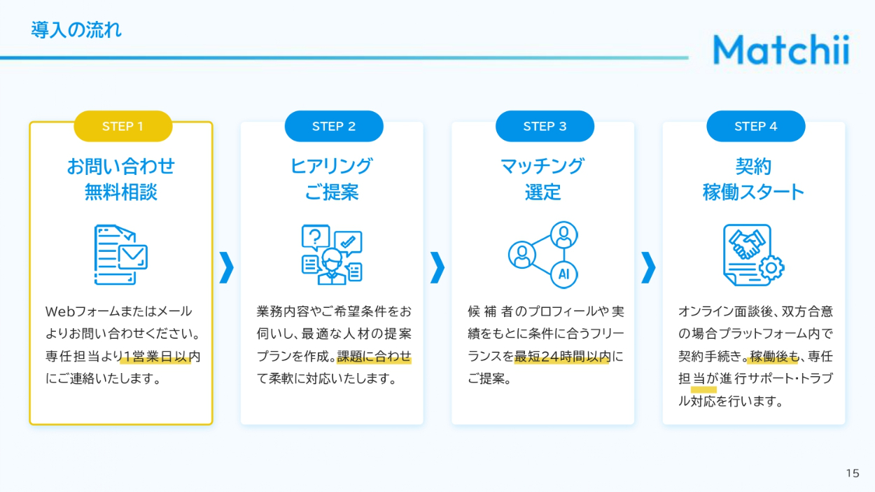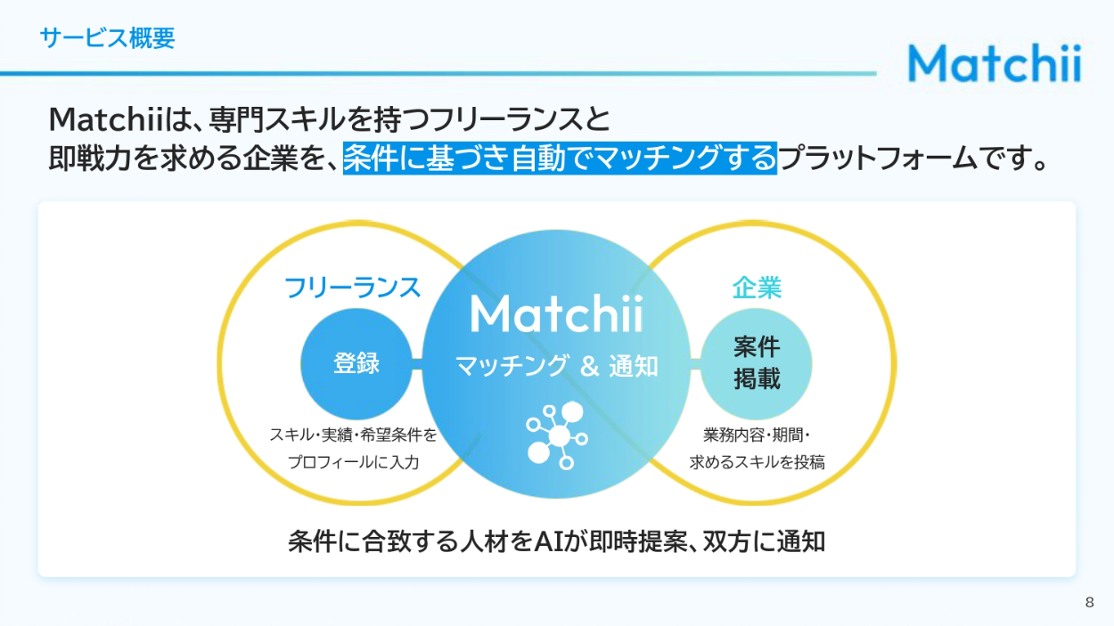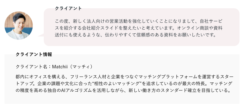 法人企業の人事担当者、経営者、DX推進部署、フリーランス人材を求めるスタートアップ企業の人事・経営層に向けて自社サービスを説明し、マッチングプラットフォームの導入を検討してもらうための資料(営業商談時の説明/PDFでの事前送付/Webサイトでの資料請求DL用)