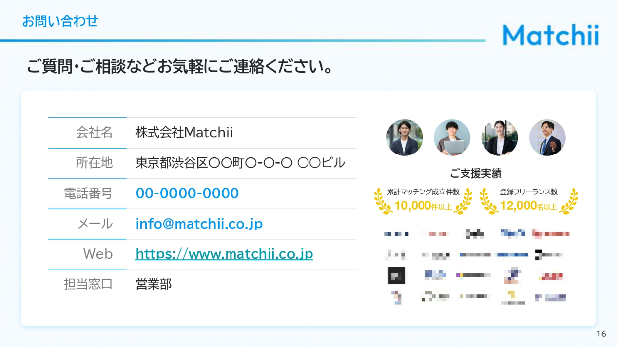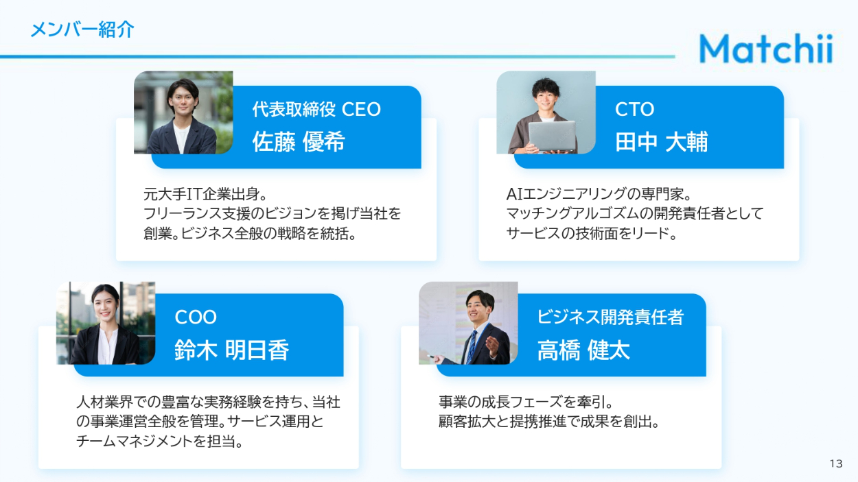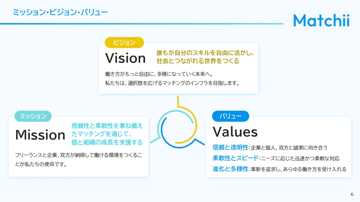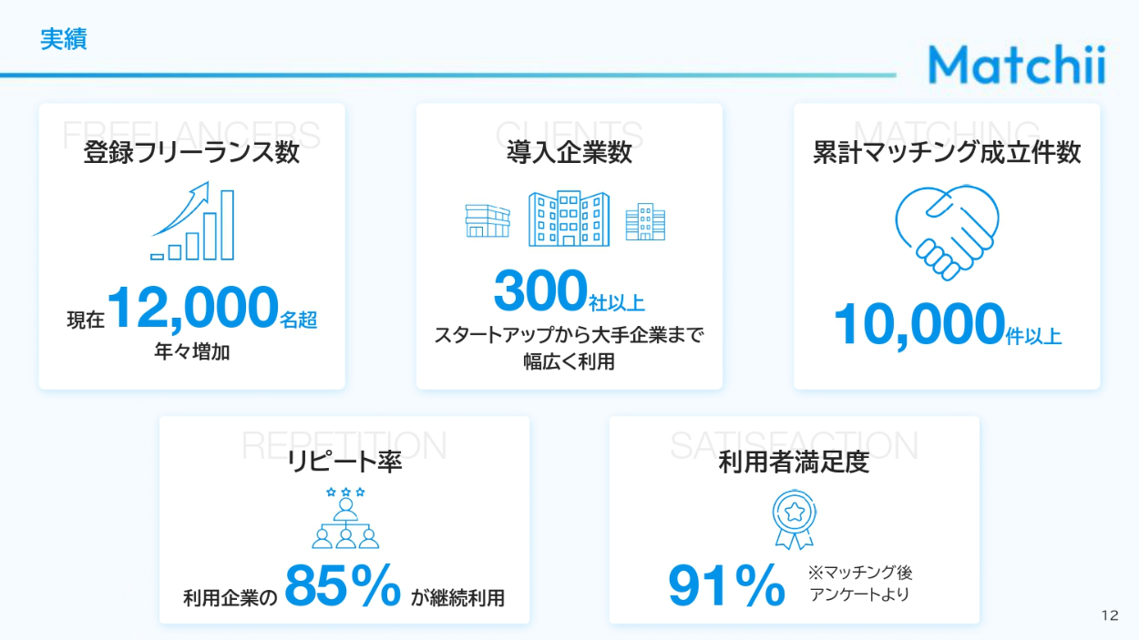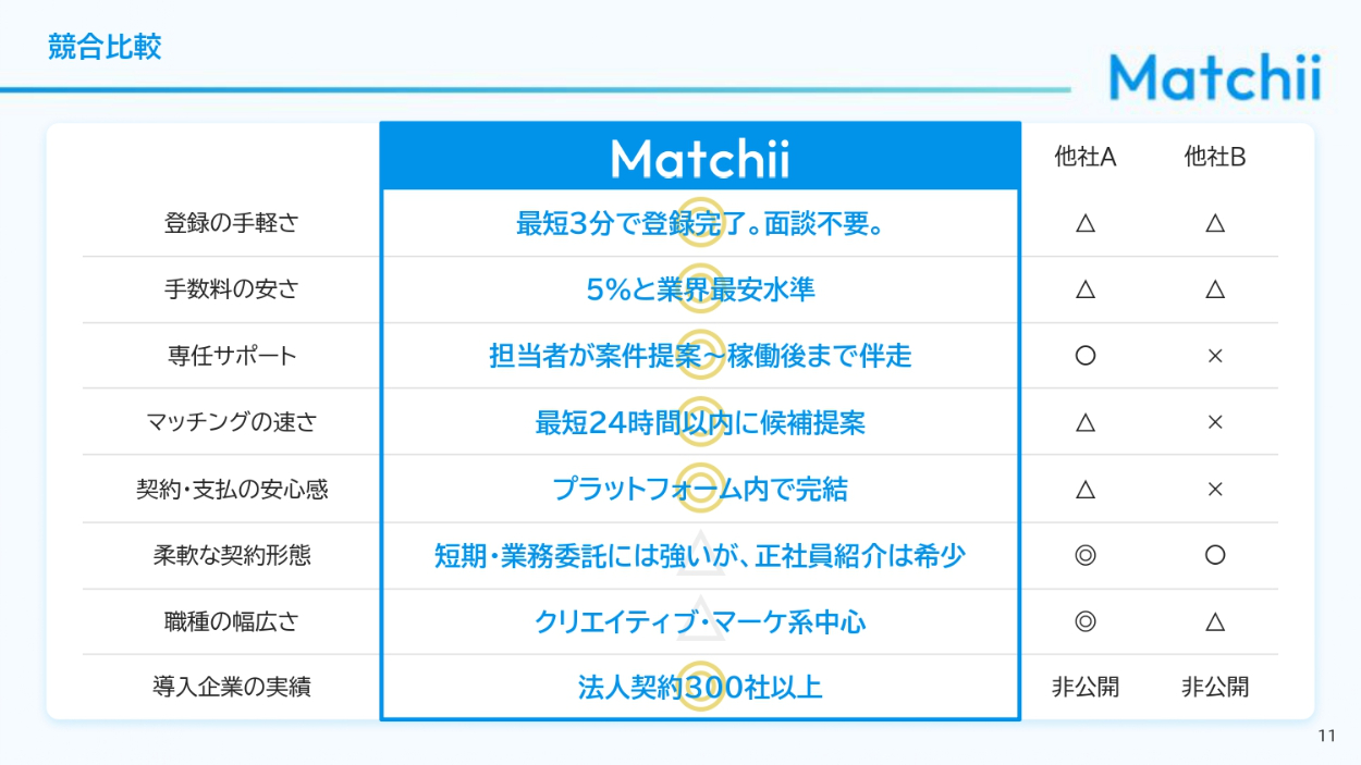 法人企業の人事担当者、経営者、DX推進部署、フリーランス人材を求めるスタートアップ企業の人事・経営層に向けて自社サービスを説明し、マッチングプラットフォームの導入を検討してもらうための資料(営業商談時の説明/PDFでの事前送付/Webサイトでの資料請求DL用)