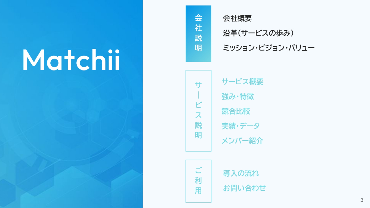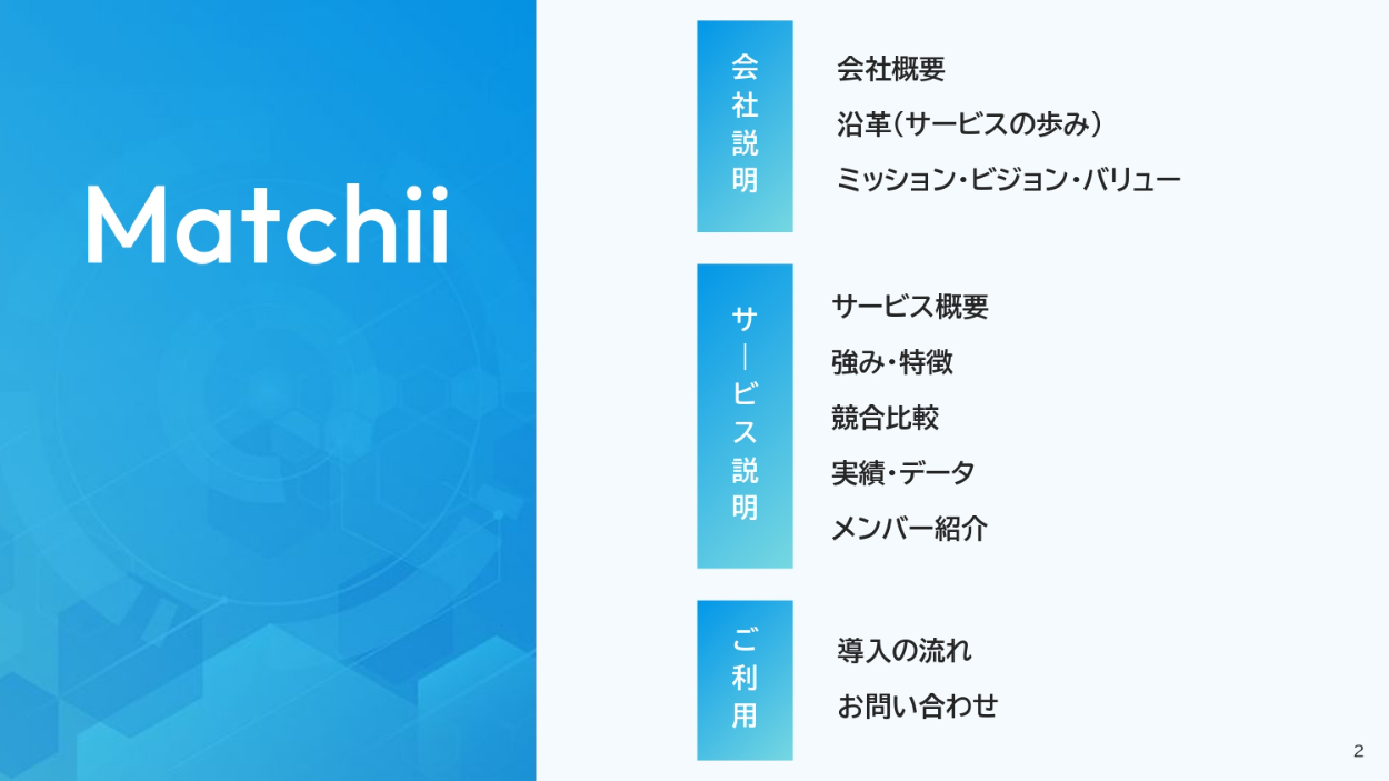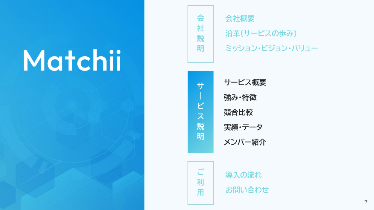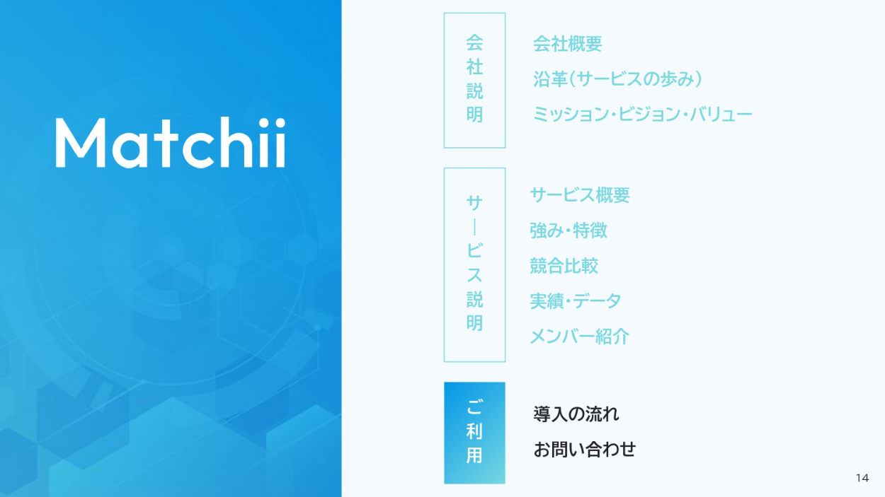 - 視覚的に伝わる図解などを用いてほしい。サービス概要のページは、図解で表現してほしい。