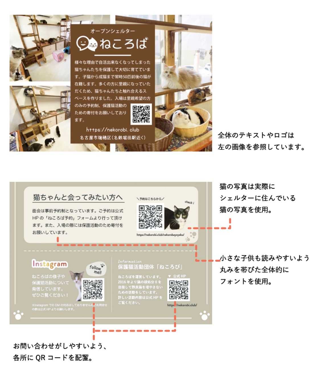 ●トンマナ:トンマナに指定はなかったため、シェルターの建物のイメージ(木造建築/木製のキャットタワーがある)から、黄色に近い茶色を使用。