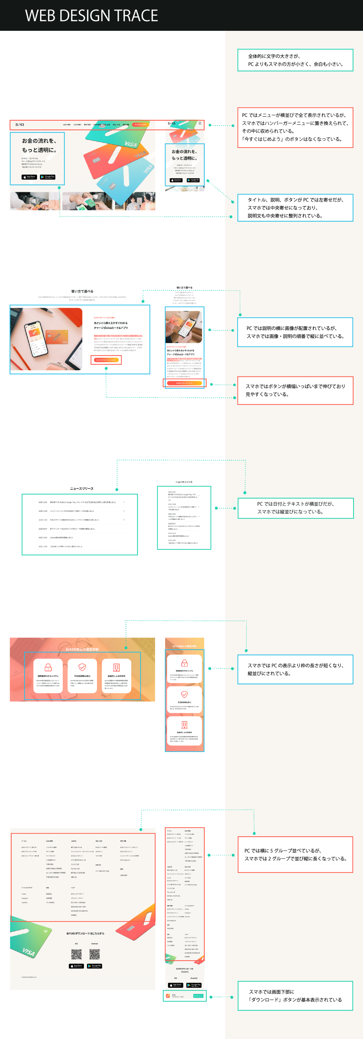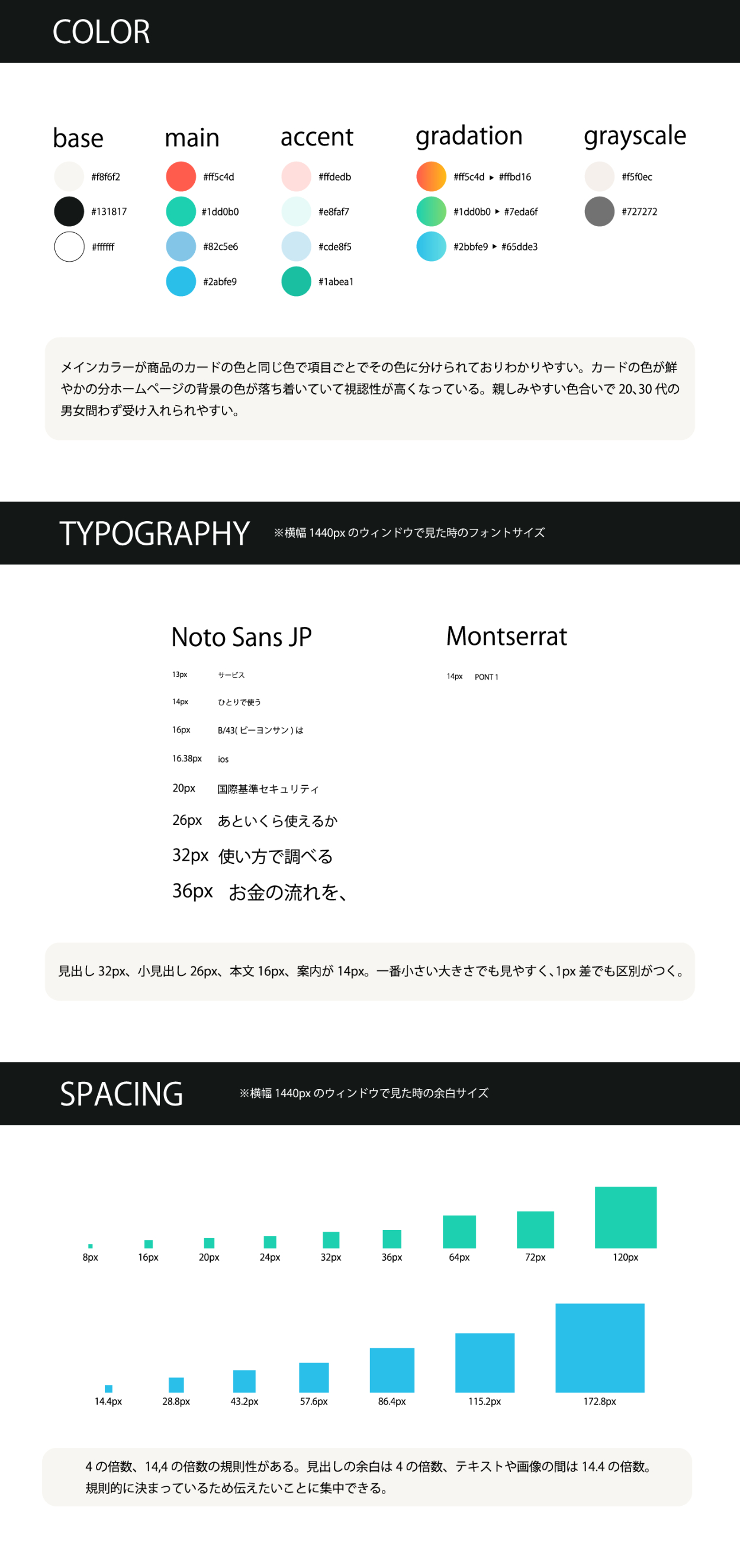 文字の大きさを合わせたり、幅の調整。HPのHTML,CSSを確認し使用されている文字やパスの濃度を確認すること。スタイルガイドの制作とレイアウトの異なる部分をまとめる際に整列、余白、配色を調整すること。